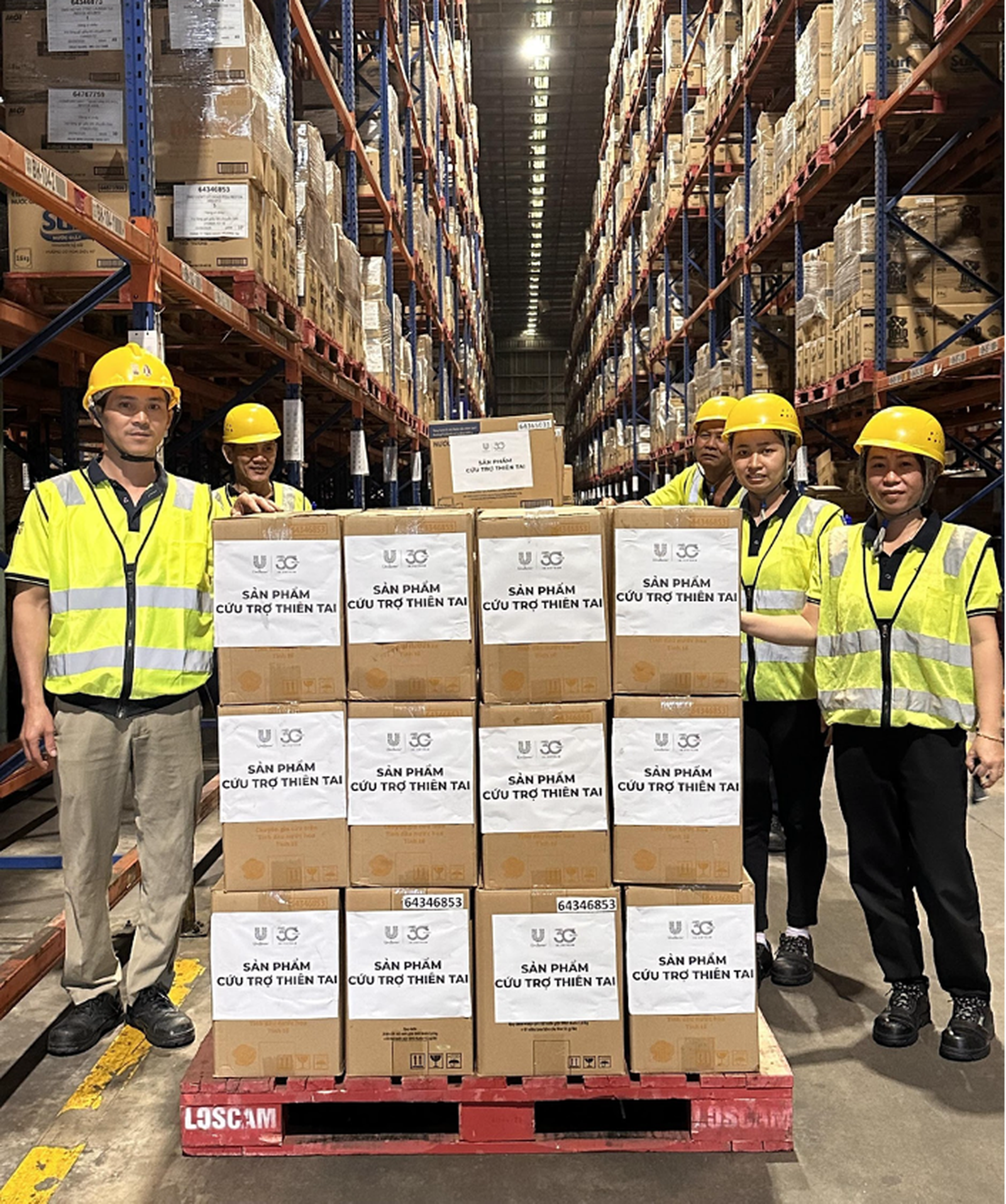 Nhân viên kho hàng Unilever chuẩn bị hàng hóa cứu trợ