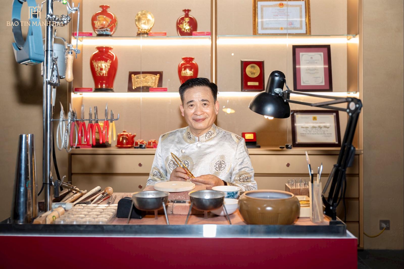Nghệ nhân Ưu tú Vũ Mạnh Hải trong không gian chế tác vàng tại cửa hàng 18 Ngô Quyền. Ảnh: Hải Thu