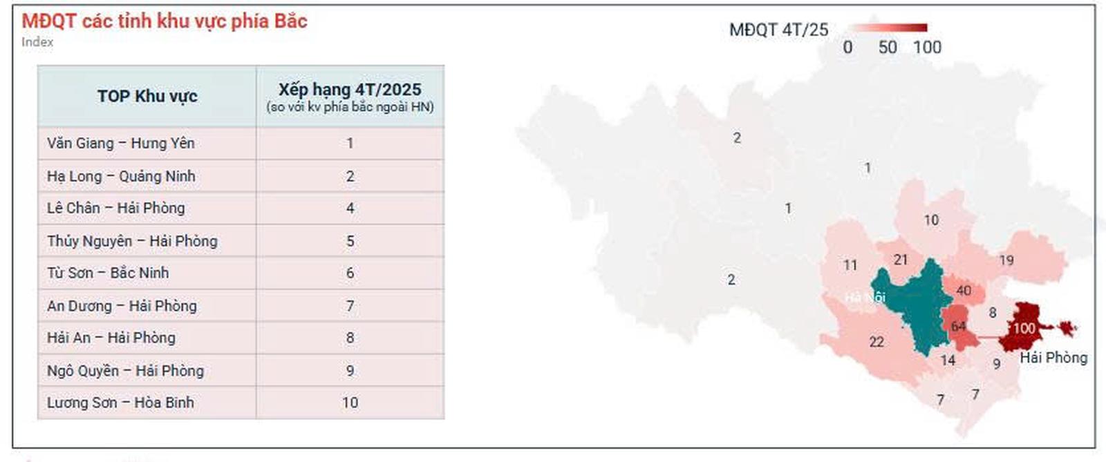 Sự góp mặt của các chủ đầu tư lớn không chỉ tạo nên diện mạo mới cho thị trường mà còn kéo theo sự gia tăng mạnh mẽ về lượng quan tâm và giao dịch. Theo báo cáo tháng 4/2025 của Batdongsan.com.vn, Hải Phòng là một trong hai địa phương phía Bắc thu hút lượng tìm kiếm nhiều nhất. Riêng quận Hải An nằm trong top 10 địa bàn có lượt tìm kiếm cao ở miền Bắc – cùng với 4 quận, huyện khác của thành phố.