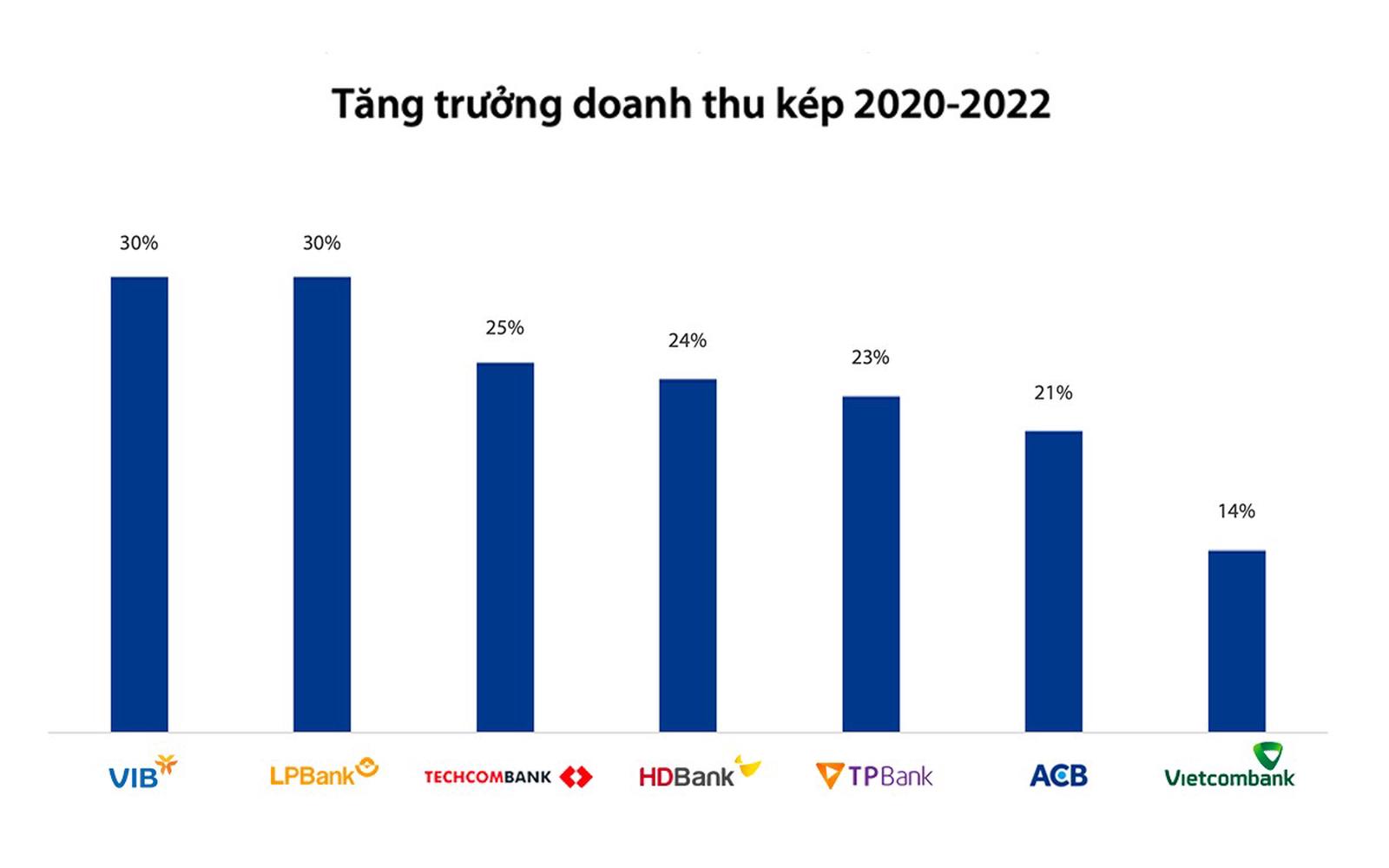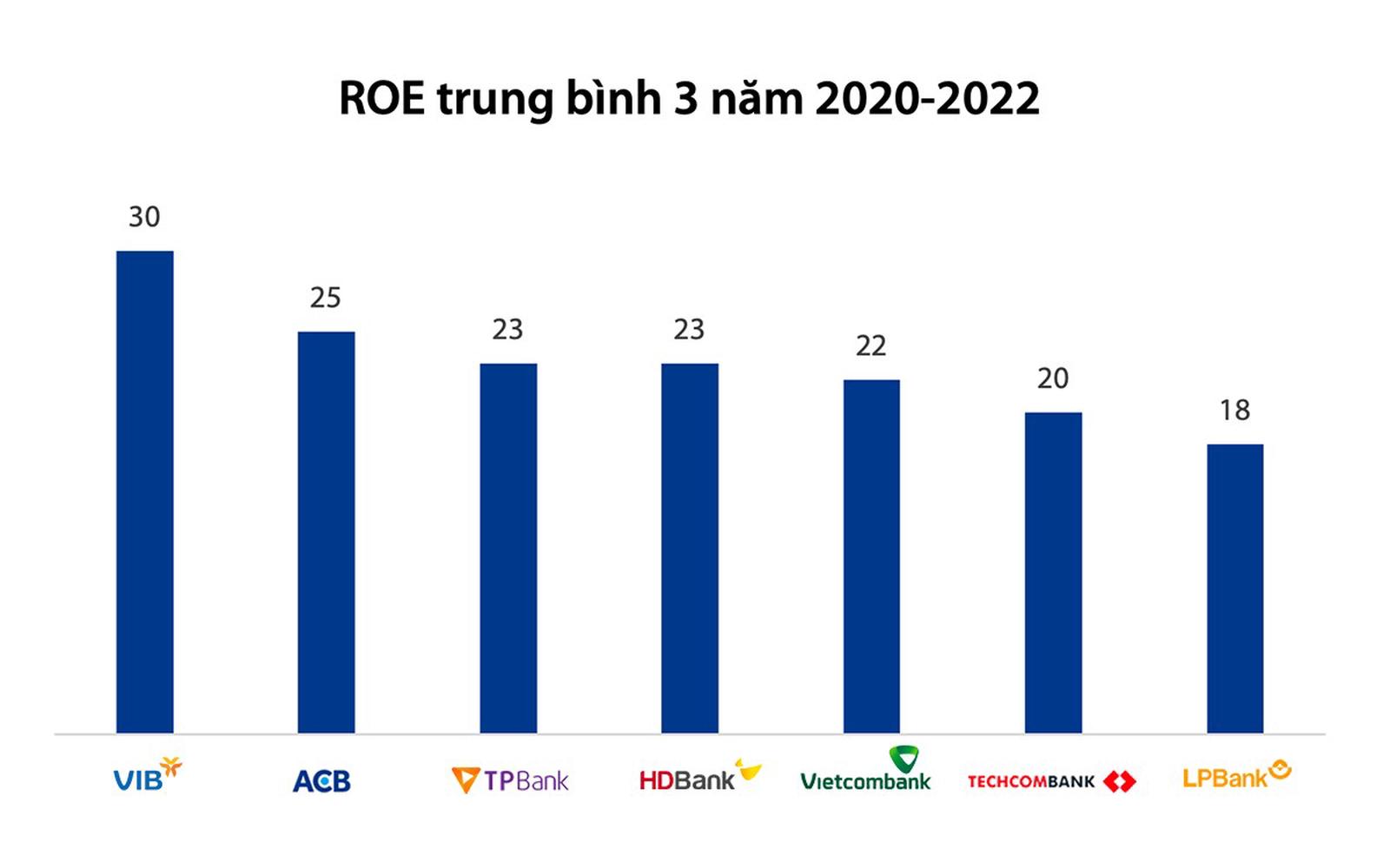 Trong 3 năm 2020-2022, chỉ số ROE của VIB vượt trội với tỷ lệ trung bình đạt tới 30%, trong khi ACB là 25%, TPBank (23%), HDBank (23%), Vietcombank (22%), Techcombank (20%), LPBank (18%).