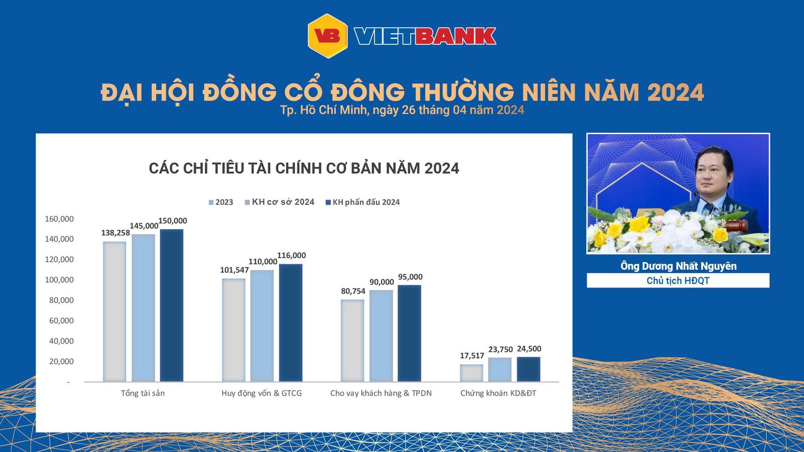 Ngày 26/4/2024, Ngân hàng TMCP Việt Nam Thương Tín (Vietbank - VBB) tổ chức thành công Đại hội đồng cổ đông (ĐHĐCĐ) thường niên bằng hình thức trực tuyến. Năm 2024, Vietbank hướng đến mục tiêu tăng trưởng lợi nhuận trước thuế đạt 29% và kiểm soát nợ xấu ở mức dưới hoặc bằng 2,5%.