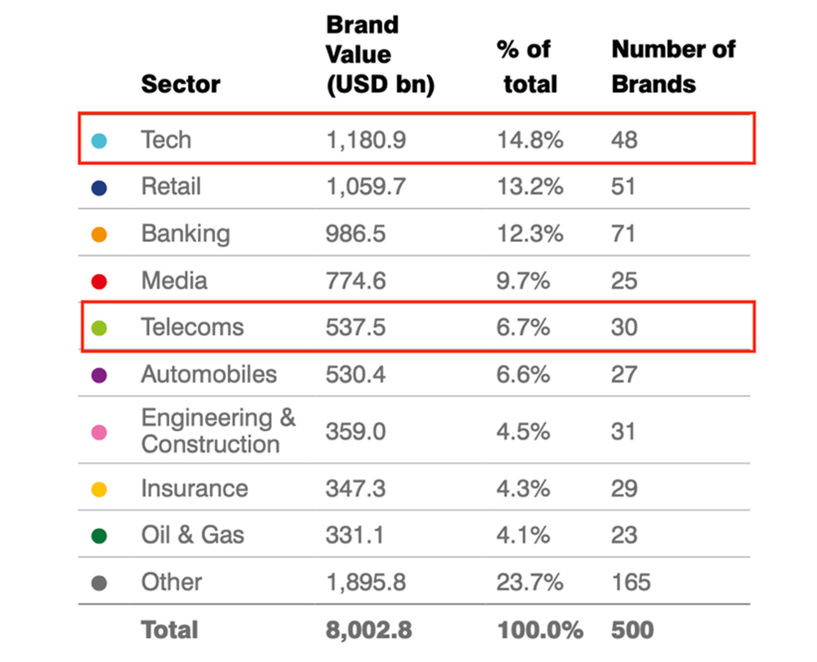 Viễn thông là ngành có giá trị thương hiệu xếp thứ 5 với 537.5 tỷ USD và chiếm 6.7% tổng giá trị.