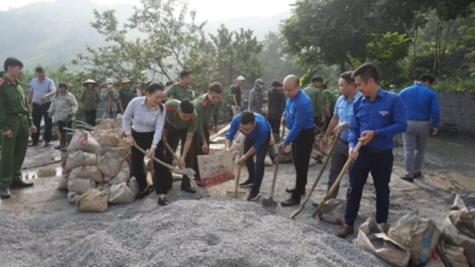 Đoàn thanh niên TCT VNPT VinaPhone và Đoàn thanh niên Cụm thi đua số 1 Công an tỉnh Hòa Bình tham gia khởi công đổ bê tông làm sân bóng chuyền cho cá em học sinh tại xóm Suối Réo. .Ảnh: C.H