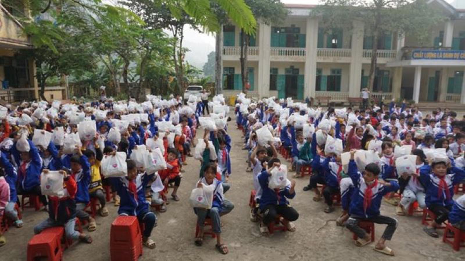 50 phần quà là quần áo ấm, bánh kẹo, sách vở được đại diện VNPT VinaPhone trao tặng tới các em học sinh xã Vĩnh Tiến. Ảnh: C.H