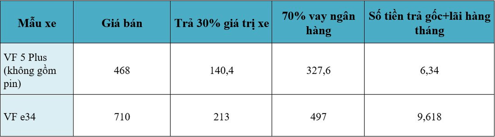Ví dụ, khi mua mẫu VF 5 plus (không bao gồm pin) với giá 468 triệu đồng, khách hàng sẽ chỉ cần chuẩn bị vốn tự có 30% giá trị xe là khoảng 140 triệu đồng, 70% còn lại được ngân hàng cho vay. Lãi suất cố định là 5% trong 2 năm đầu. Tính ra mỗi tháng cả gốc và lãi, chủ xe VF 5 Plus trả hơn 6,3 triệu đồng.