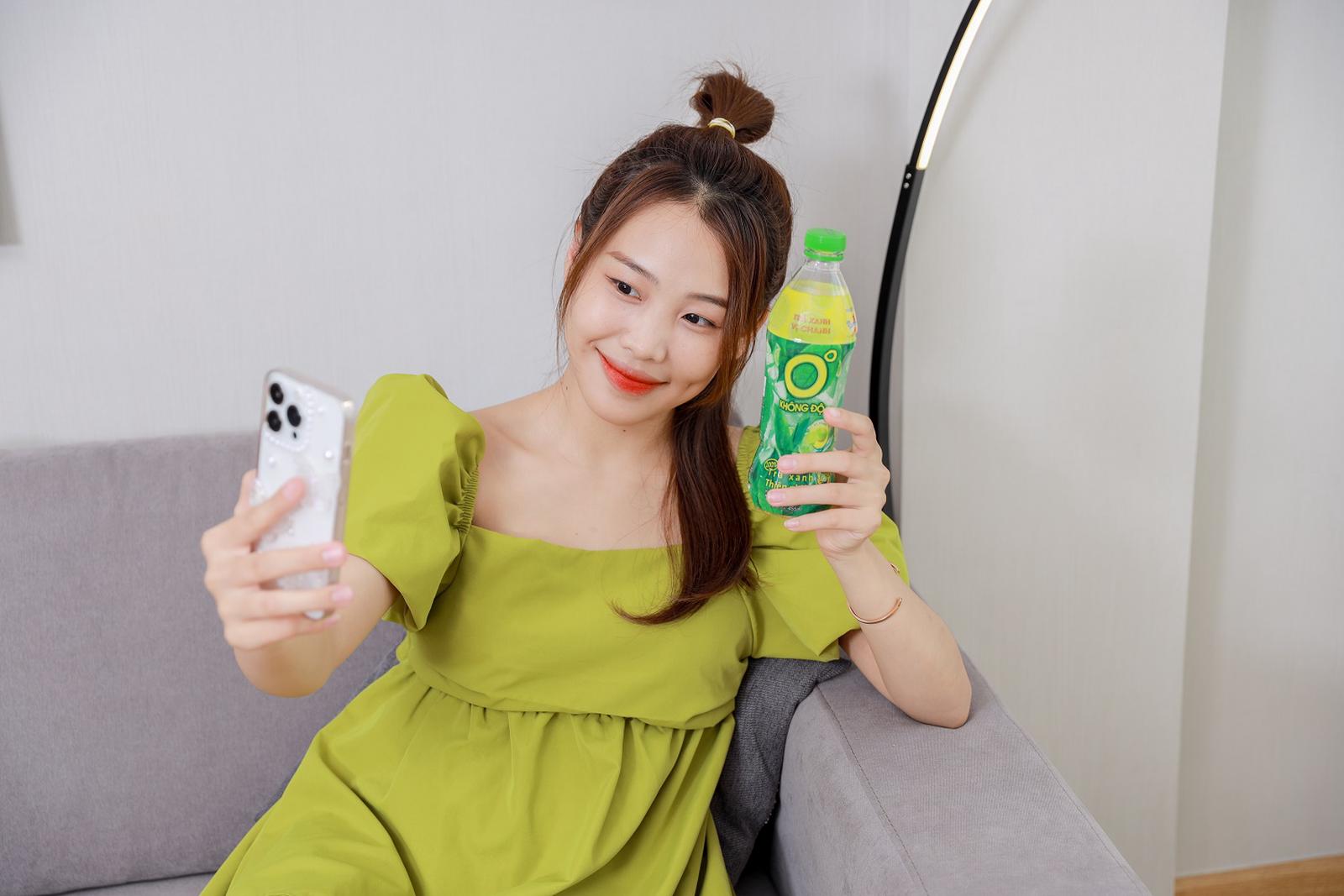 Phương Thảo, nữ chuyên viên thiết kế độ họa nói trên vừa gọi video messenger cho quản lý studio ảnh cưới để trao đổi về style hình ảnh chủ đạo cho các cặp đôi, vừa thong thả uống chai Trà Xanh Không Độ.