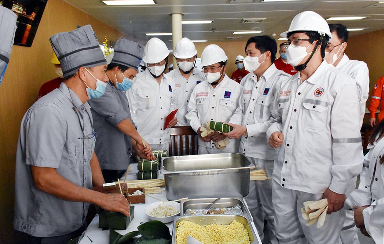 Đoàn Công tác thăm khu vực bếp ăn của Giàn CNTT 3 - nơi các đầu bếp đang gói bánh chưng chuẩn bị đón Tết Nguyên đán trên giàn