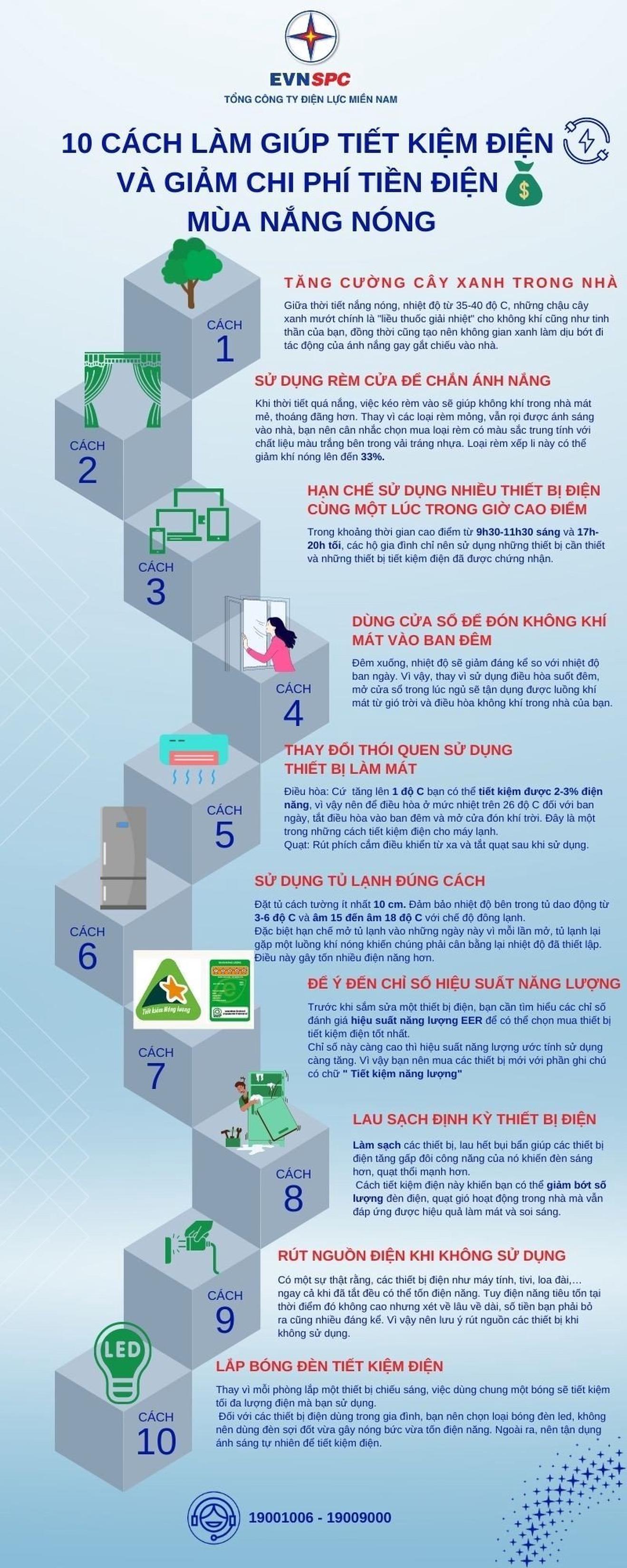 Nhằm tăng cường tuyên truyền, hướng dẫn người dân cách sử dụng điện an toàn, tiết kiệm và hiệu quả, mới đây, Tổng Công ty Điện lực miền Nam đã đưa ra 10 cách làm giúp tiết kiệm điện và giảm chi phí tiền điện mùa nắng nóng, bao gồm: