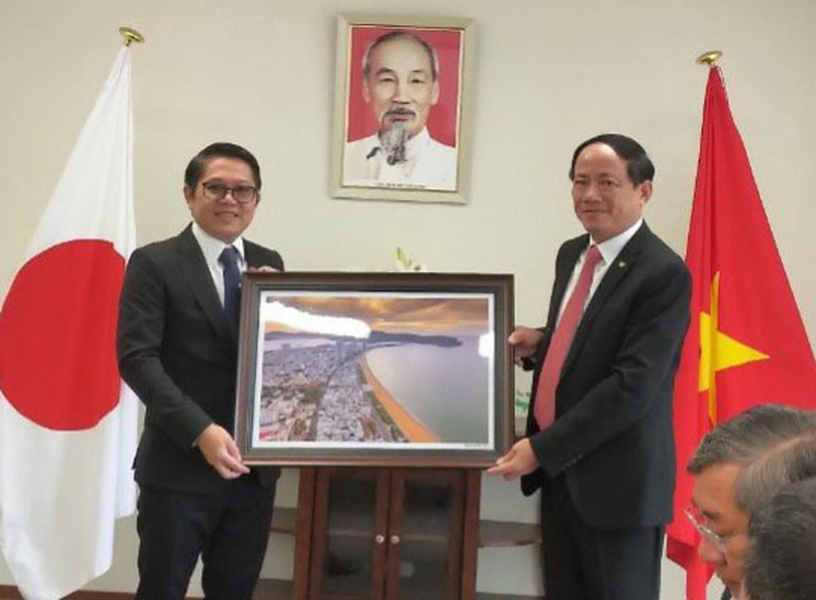 Chủ tịch UBND tỉnh Bình Định Phạm Anh Tuấn tặng quà lưu niệm cho Tổng Lãnh sự quán Việt Nam tại Osaka