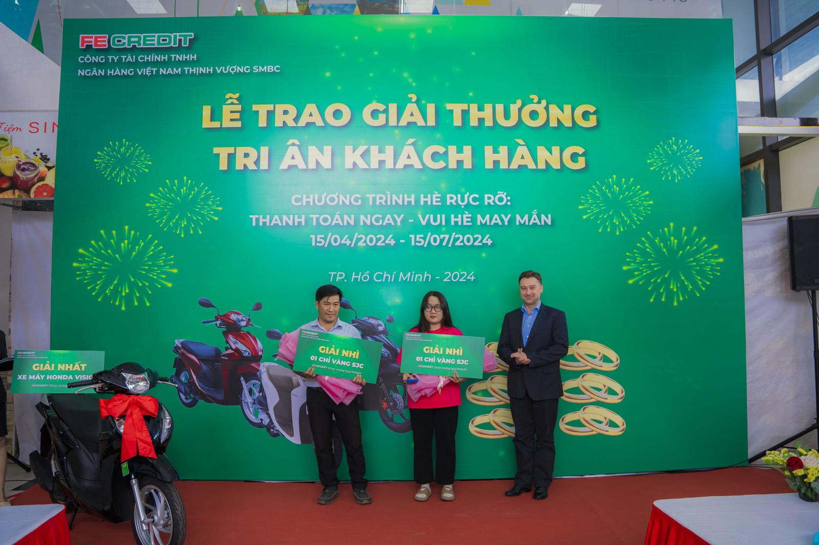Đại diện FE CREDIT trao hai giải nhì là hai chỉ vàng SJC cho khách hàng may mắn trúng thưởng. Ảnh: FE CREDIT.