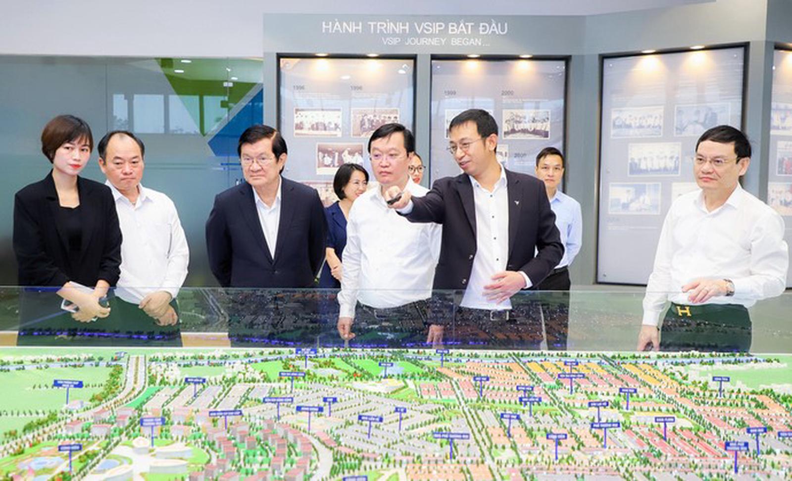 Lãnh đạo Công ty TNHH VSIP Nghệ An báo cáo tổng quan dự án với nguyên Chủ tịch nước Trương Tấn Sang.