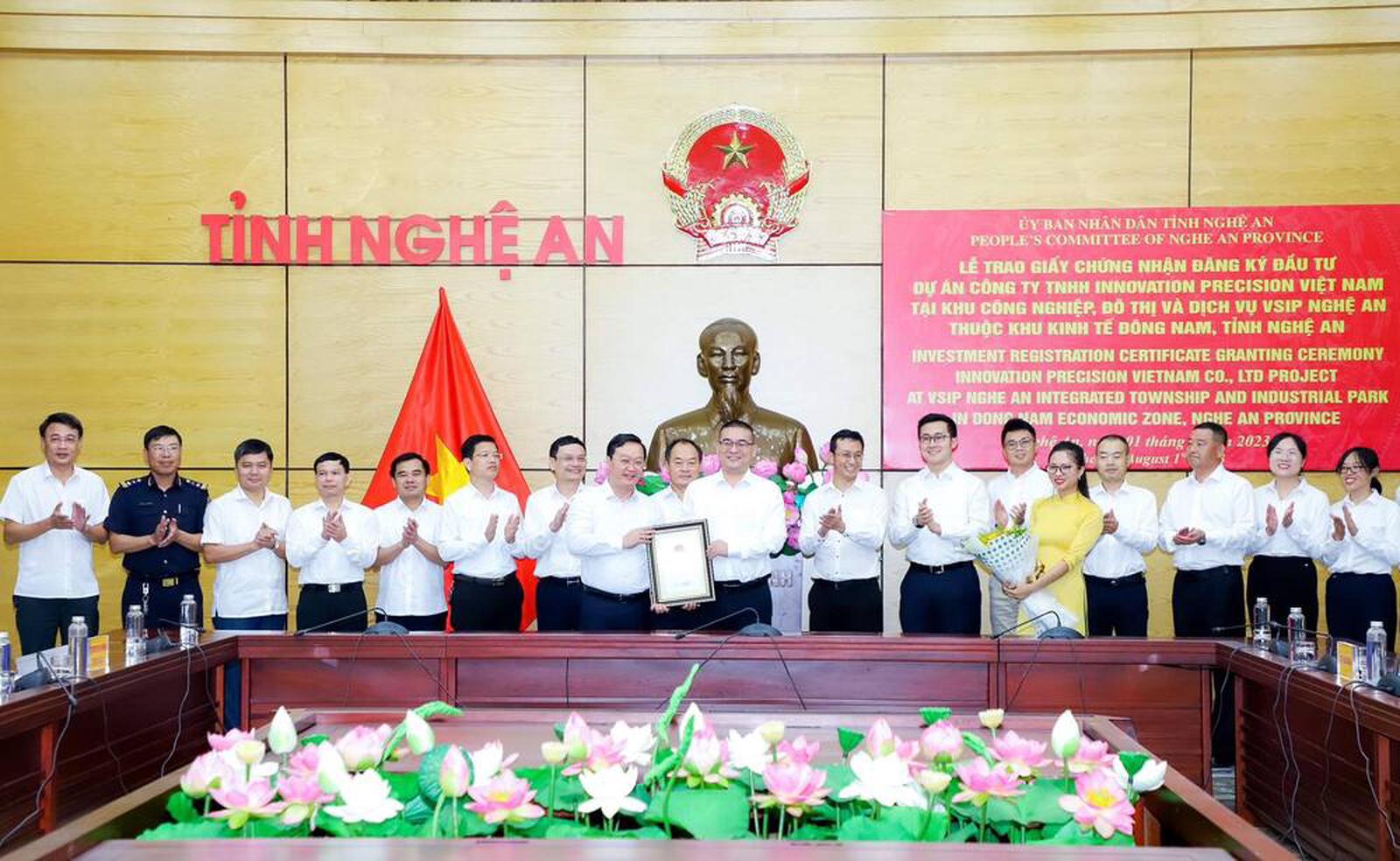 Chủ tịch UBND tỉnh Nghệ An Nguyễn Đức Trung trao giấy chứng nhận đăng ký đầu tư dự án cho Công ty TNHH Innovation Precision tại KCN VSIP Nghệ An