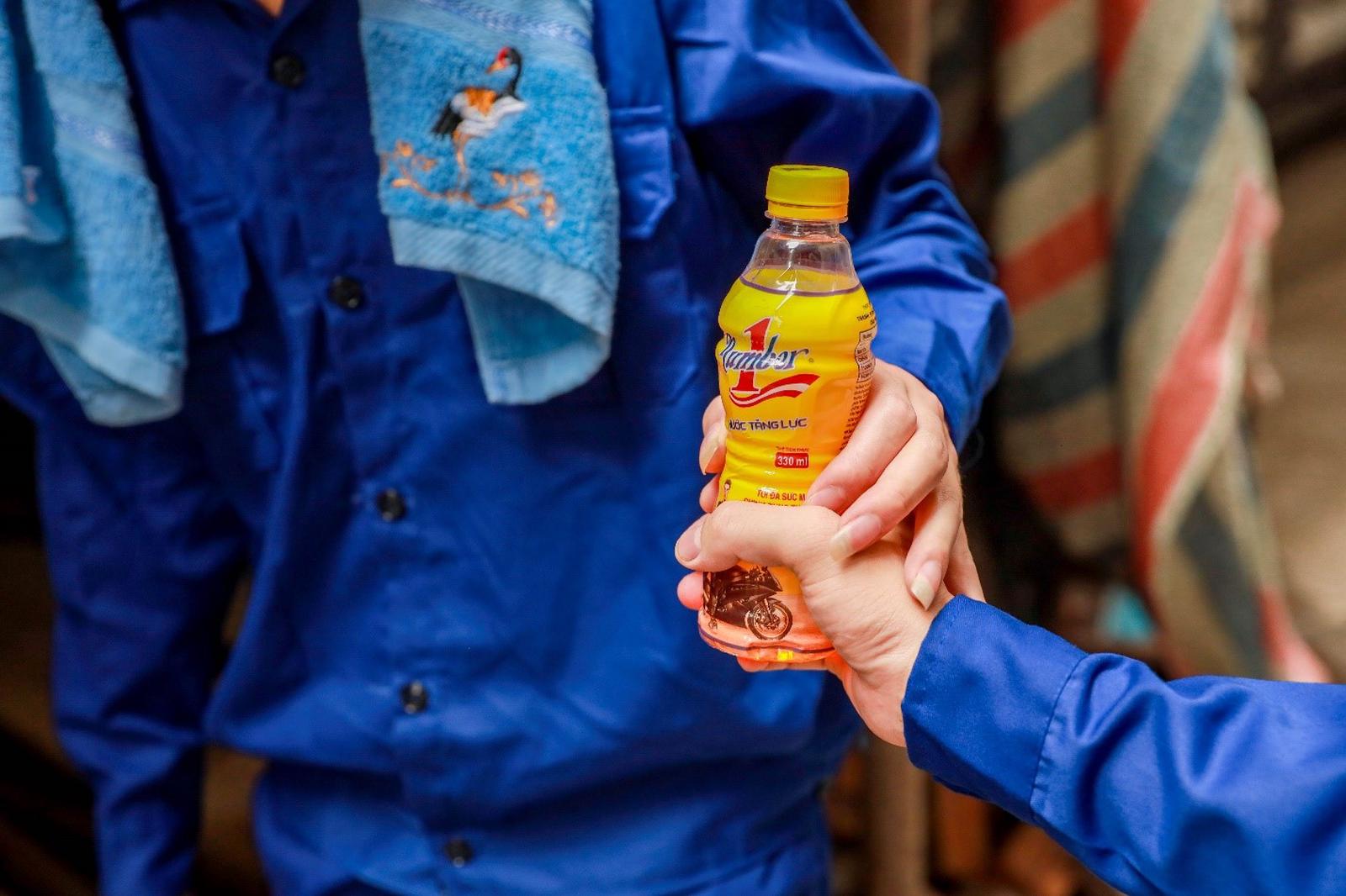Quan tâm sức khỏe đội thợ giữa thời tiết khắc nghiệt, những ngày này anh Minh thường chuẩn bị sẵn nước uống cho anh em để giải khát giữa giờ. Anh cho biết “Thường một ngày làm việc sẽ có 3-4 buổi giải lao, mỗi buổi kéo dài 10-15 phút. Nước uống luôn được chuẩn bị sẵn sàng cho anh em thợ lẫn phụ. Nước uống cho thợ xây nếu chỉ dùng nước lọc giải khát thôi là chưa đủ vì nắng nóng khiến mọi người mệt và mất sức nhanh. Tôi thường mua thêm nước tăng lực Number 1. Đa phần các anh em đều thích hương vị của sản phẩm này, làm việc sau giờ uống nước giải lao cũng sung sức hơn hẳn”.