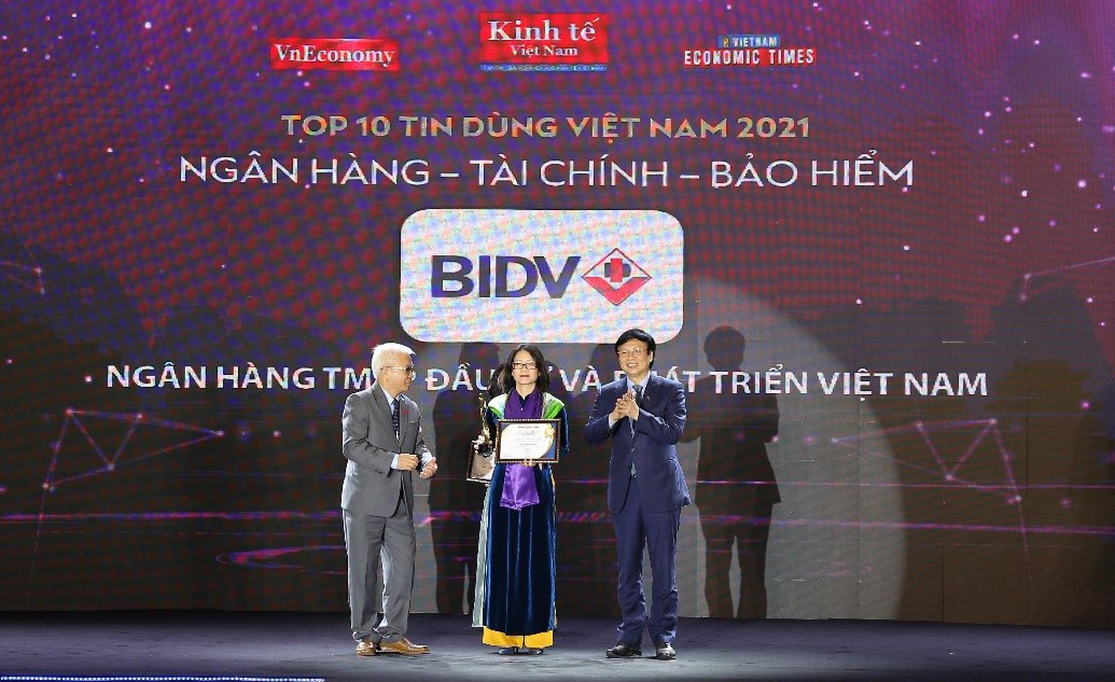 *.Được nhiều tổ chức uy tín trong nước và quốc tế ghi nhận với nhiều giải thưởng: Tổ chức định hạng tín nhiệm Moody’s tiếp tục định hạng nhà phát hành của BIDV ở mức ngang trần quốc gia và thuộc nhóm các ngân hàng có định hạng tín nhiệm cao nhất tại Việt Nam; Top 2.000 công ty đại chúng lớn nhất và quyền lực nhất thế giới (Tạp chí Forbes); Top 25 Thương hiệu tài chính dẫn đầu và Top 50 Công ty niêm yết tốt nhất Việt Nam (Forbes Việt Nam); Top 10 Doanh nghiệp lớn nhất (Vietnam Report); Ngân hàng SME tốt nhất Đông Nam Á, Ngân hàng Bán buôn số 1 của năm, Ngân hàng điện tử sáng tạo nhất Việt Nam (Tạp chí Global Banking & Finance Review); Ngân hàng bán lẻ tốt nhất Việt Nam (The Banker); BIDV cũng được Bộ Thông tin và truyền thông, NHNN xếp hạng nhất lần thứ 12 liên tiếp trong khối NHTM tại Việt Nam về chỉ số sẵn sàng cho phát triển và ứng dụng CNTT và có 06 sản phẩm ứng dụng CNTT đạt giải thưởng Sao Khuê 2021; cú đúp giải thưởng Ngân hàng chuyển đổi số xuất sắc 2021 (do tạp chí Global Finance và Hiệp hội truyền thông số Việt Nam trao tặng.