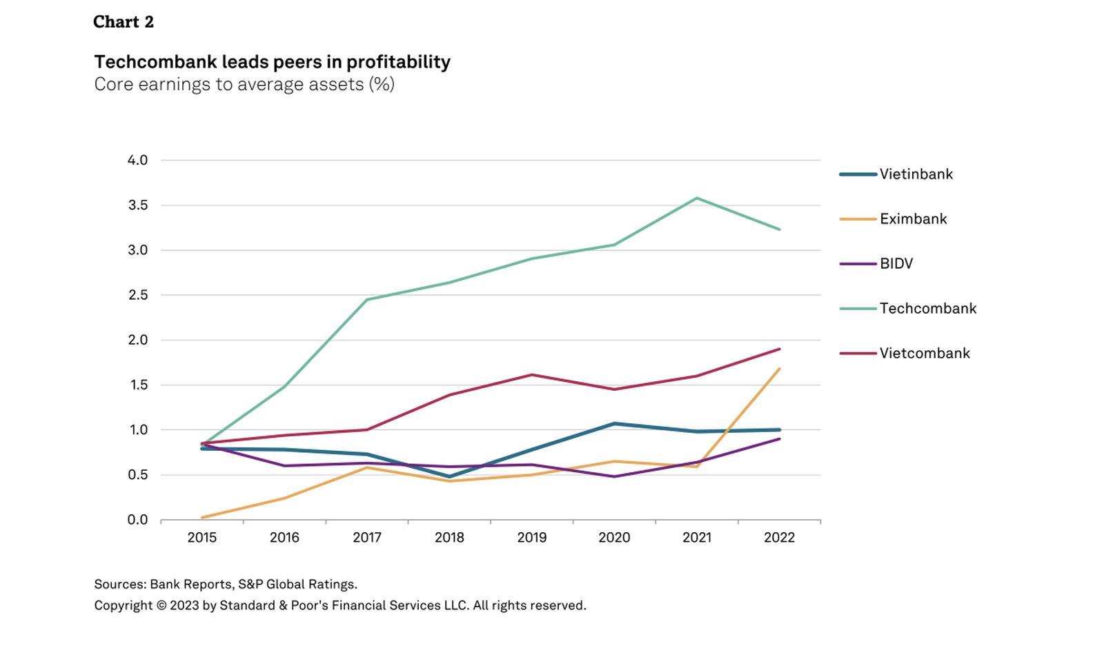 Báo cáo của S&P vào tháng 9.2023 nhận định, vị thế vốn an toàn ở mức cao, cùng tỉ suất sinh lời hàng đầu cho phép Techcombank (TCB) chủ động quyết định chiến lược đầu tư phù hợp, và đẩy mạnh mảng ngân hàng bán lẻ.