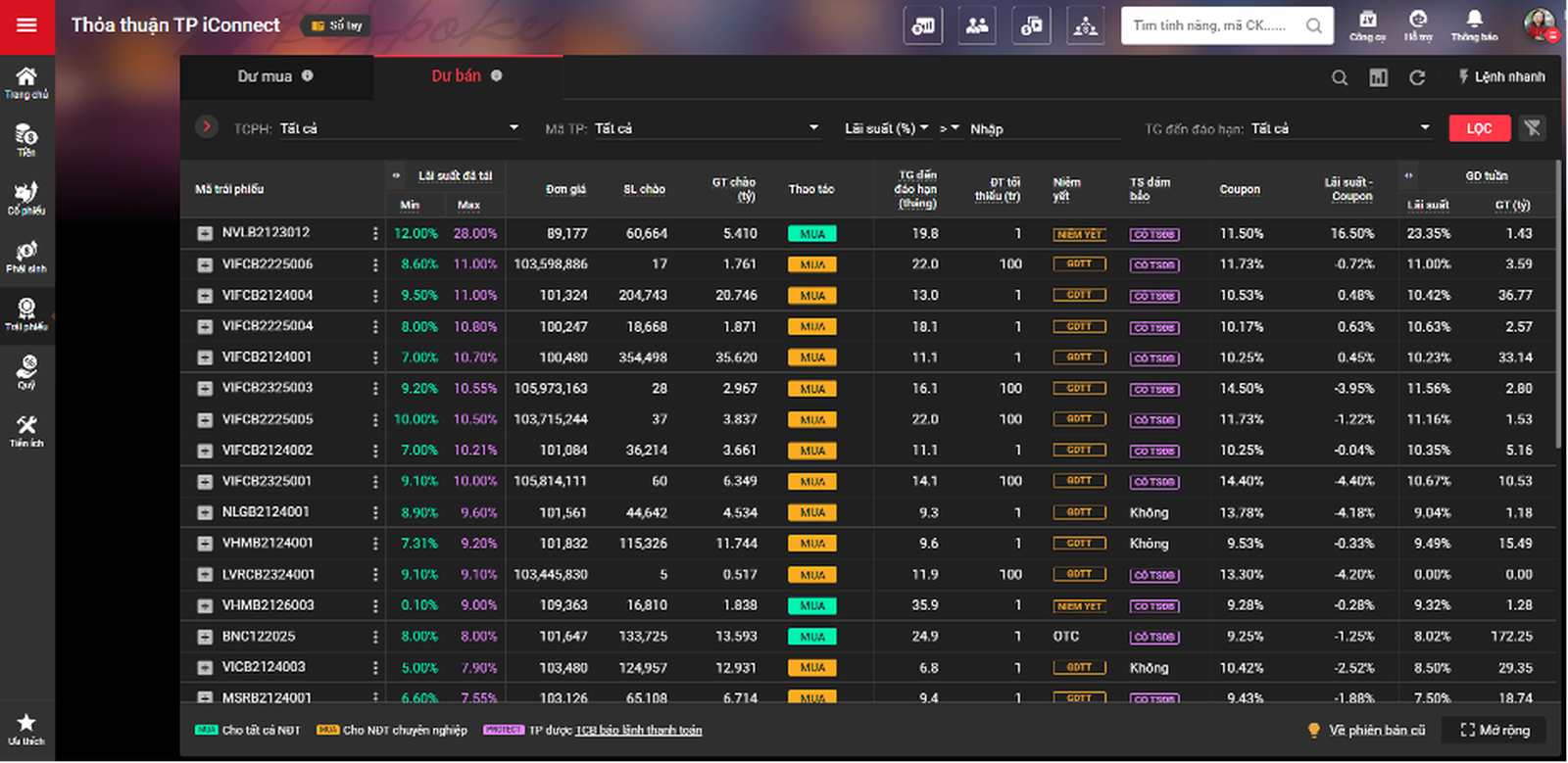 Các nhà đầu tư ngay từ ngày 19/07/2023 có thể đặt lệnh giao dịch trái phiếu riêng lẻ ở TCBS tại màn hình thỏa thuận Trái phiếu iConnect trên hệ thống TCInvest. Đưa vào hoạt động từ 5 năm trước, iConnect là dự án công nghệ tiên phong số hóa việc mua bán trái phiếu doanh nghiệp, hỗ trợ theo dõi, tìm kiếm các lệnh rao mua/bán trái phiếu.