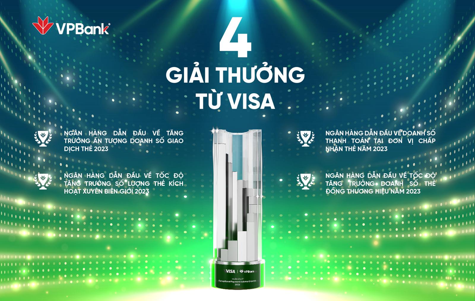 Không chỉ Mastercard, Visa cũng gọi tên VPBank ở 4 hạng mục giải thưởng uy tín: Ngân hàng dẫn đầu về tăng trưởng ấn tượng doanh số giao dịch thẻ 2023; dẫn đầu về tốc độ tăng trưởng số lượng thẻ kích hoạt xuyên biên giới 2023; dẫn đầu về doanh số thanh toán tại đơn vị chấp nhận thẻ năm 2023; dẫn đầu về tốc độ tăng trưởng doanh số thẻ đồng thương hiệu năm 2023.