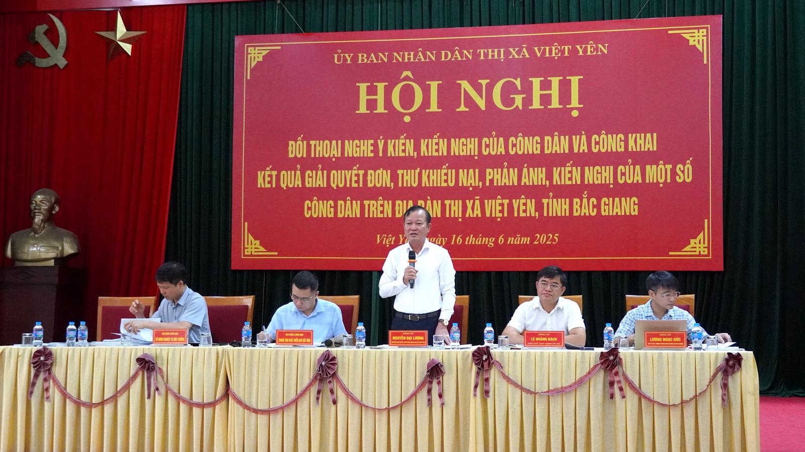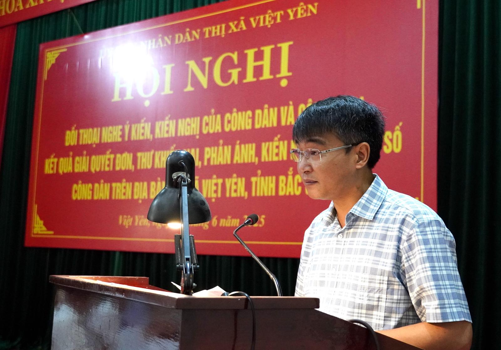 (Thanh tra) - Ngày 16/6/2025, thực hiện Thông báo số 246/TB-TCT ngày 19/5/2025 của Tổ công tác theo Quyết định số 1081/QĐ-TU ngày 11/4/2025 của Ban Thường vụ Tỉnh uỷ Bắc Giang, UBND thị xã Việt Yên tổ chức Hội nghị Đối thoại nghe ý kiến, kiến nghị của công dân và công khai kết quả giải quyết đơn thư khiếu nại, phản ánh, kiến nghị của một số công dân trên địa bàn thị xã.