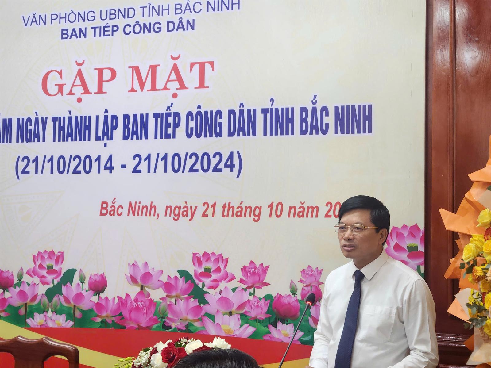 Tại buổi lễ, ông Nguyễn Đăng Quang, Phó trưởng Ban Tiếp công dân tỉnh Bắc Ninh chia sẻ, ngày 21/10/2014, Chủ tịch UBND tỉnh Bắc Ninh ban hành Quyết định số 446/QĐ-UBND đánh dấu sự ra đời của Ban Tiếp công dân, trực thuộc Văn phòng UBND tỉnh.