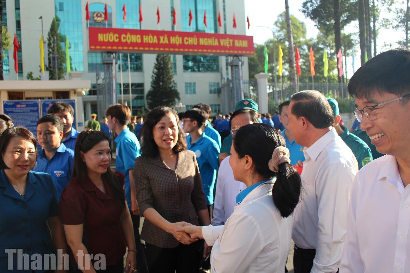 Chủ tịch Uỷ ban MTTQ tỉnh Huỳnh Thị Hằng tiễn đoàn công tác hỗ trợ tỉnh Đăk Lăk do bão lũ gây ra. Ảnh: Minh Nghĩa