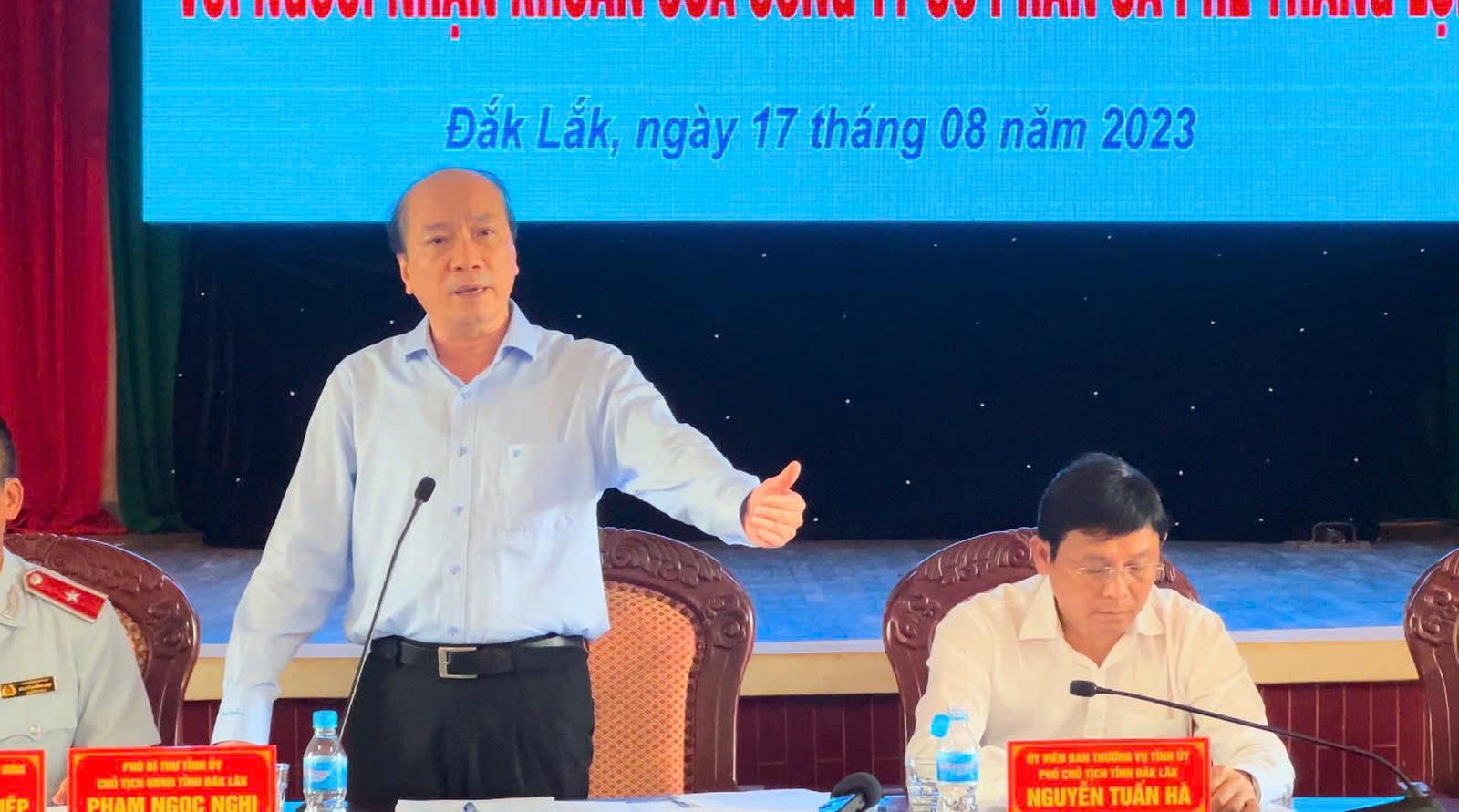 Chủ tịch UBND tỉnh Đắk Lắk Phạm Ngọc Nghị phát biểu trong một buổi đối thoại với người dân tại Công ty Cổ phần cà phê Thắng Lợi. Ảnh: NG