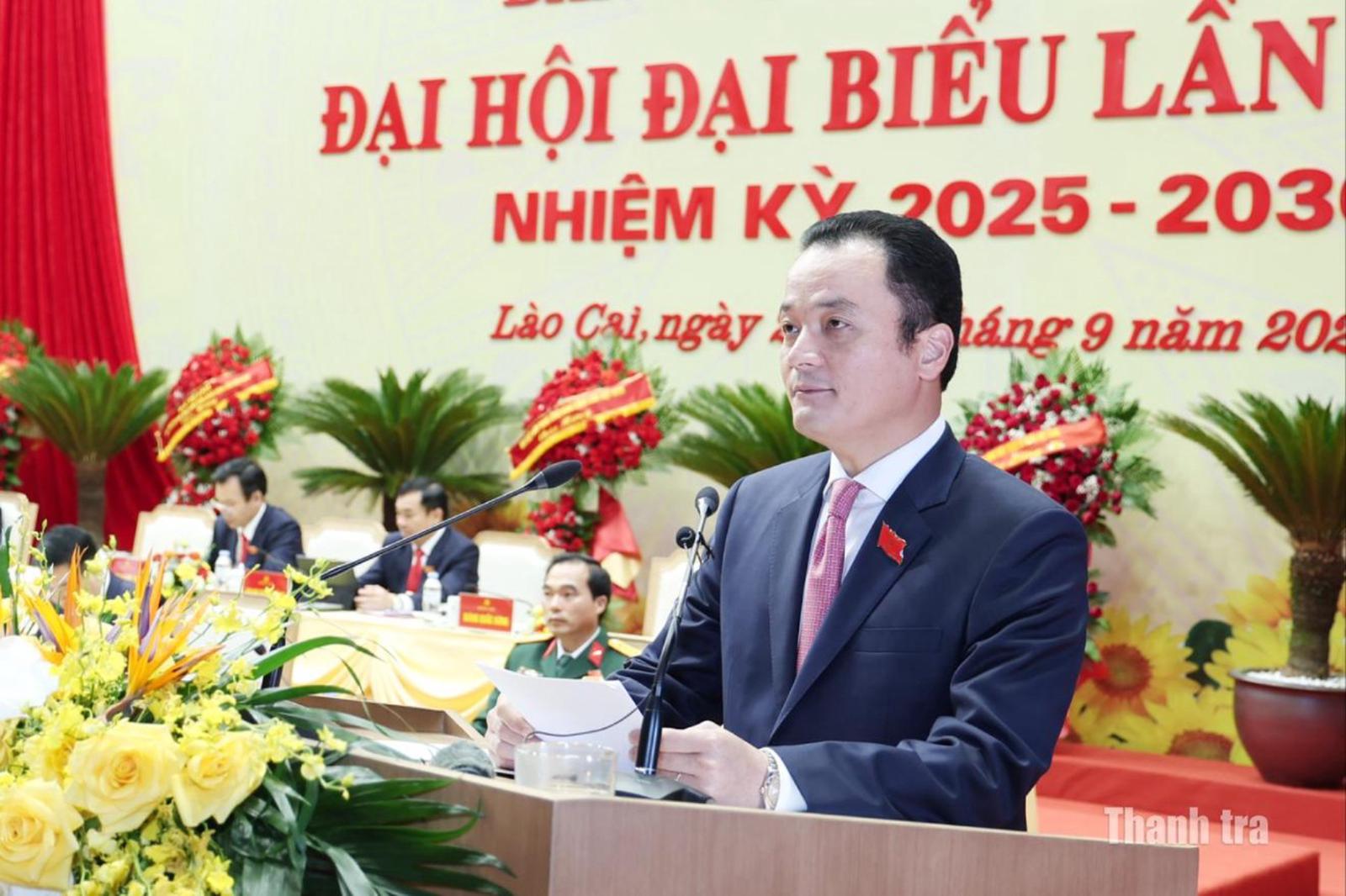 Ông Giàng Quốc Hưng, Trưởng Ban Nội chính Tỉnh ủy trình bày tham luận “Đẩy mạnh giáo dục cần, kiệm, liêm chính trong hệ thống chính trị gắn với đẩy mạnh phòng, chống tham nhũng, lãng phí, tiêu cực” tại Đại hội đại biểu Đảng bộ tỉnh Lào Cai lần thứ I, nhiệm kỳ 2025 - 2030. Ảnh: Bùi Bình