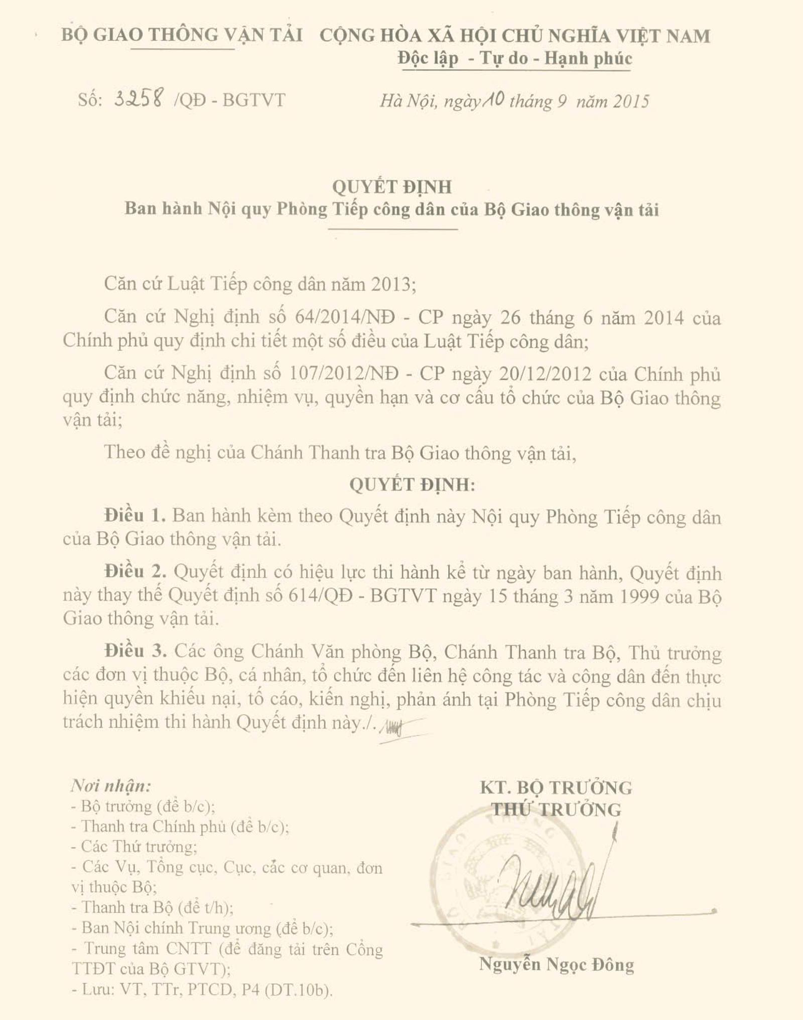 Quyết định số 3258/QĐ-BGTVT về việc "ban hành Nội quy Phòng Tiếp công dân của Bộ Giao thông vận tải". Ảnh: TQ