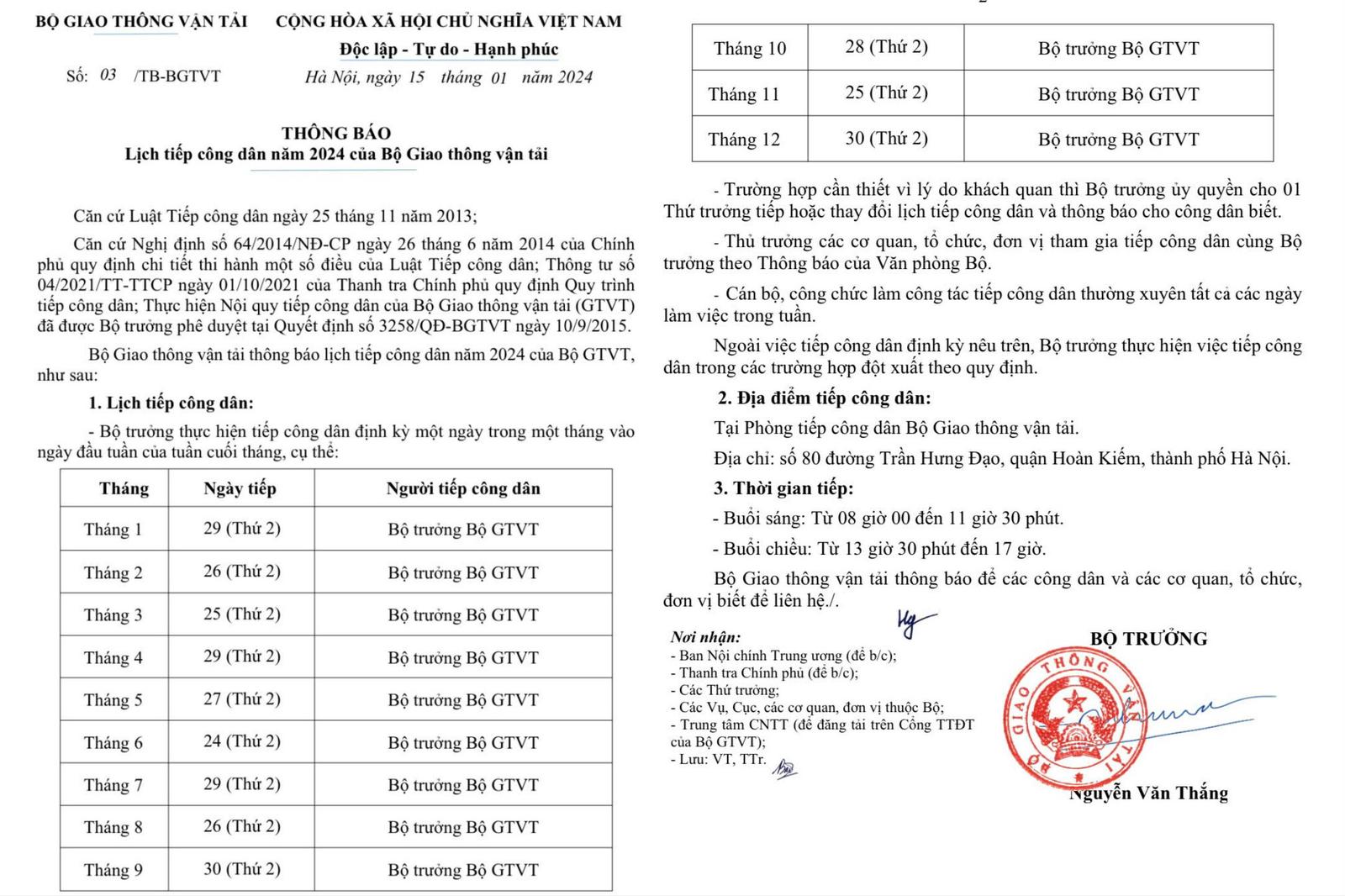 Lịch tiếp dân năm 2024 của Bộ trưởng bộ GTVT. Ảnh: TQ