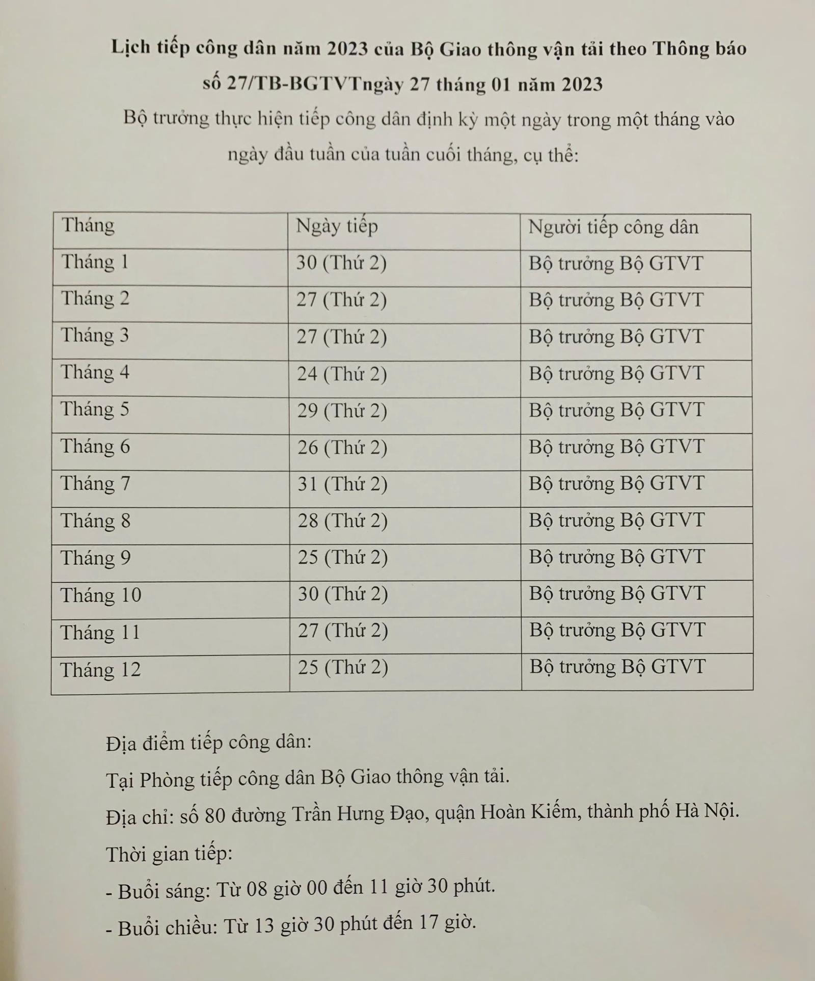 Lịch tiếp dân năm 2023 của Bộ trưởng bộ GTVT. Ảnh: TQ