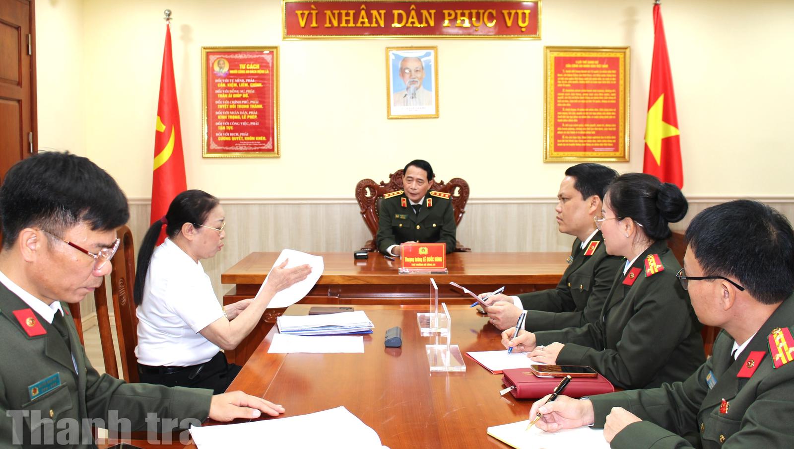 Cùng dự buổi làm việc có Trung tướng Bùi Quang Thanh, Chánh Thanh tra Bộ Công an; Đại tá Phan Thị Loan, Phó Chánh Thanh tra Bộ Công an. Ảnh: Trọng Tài