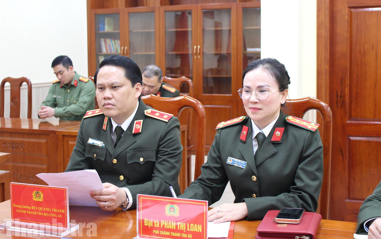 Cùng dự buổi làm việc có Trung tướng Bùi Quang Thanh, Chánh Thanh tra Bộ Công an; Đại tá Phan Thị Loan, Phó Chánh Thanh tra Bộ Công an; đại diện các đơn vị chức năng thuộc Thanh tra Bộ Công an...