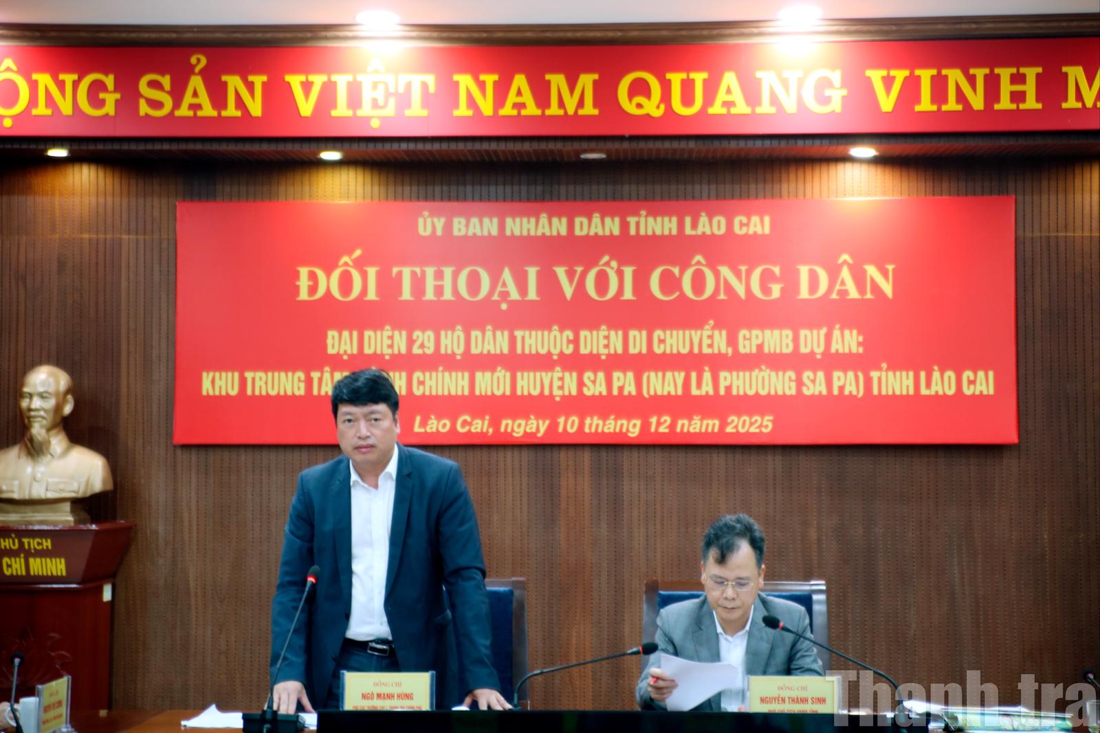 Tham dự buổi đối thoại có ông Nguyễn Thành Sinh, Phó Chủ tịch UBND tỉnh Lào Cai chủ trì buổi làm việc; ông Ngô Mạnh Hùng, Phó Cục trưởng Cục I, Thanh tra Chính phủ; lãnh đạo Sở Xây dựng, Sở Nông nghiệp và Môi trường, Sở Xây dựng, Ủy ban MTTQ tỉnh; lãnh đạo UBND phường Sa Pa và đại diện các hộ dân nằm trong diện thu hồi đất.