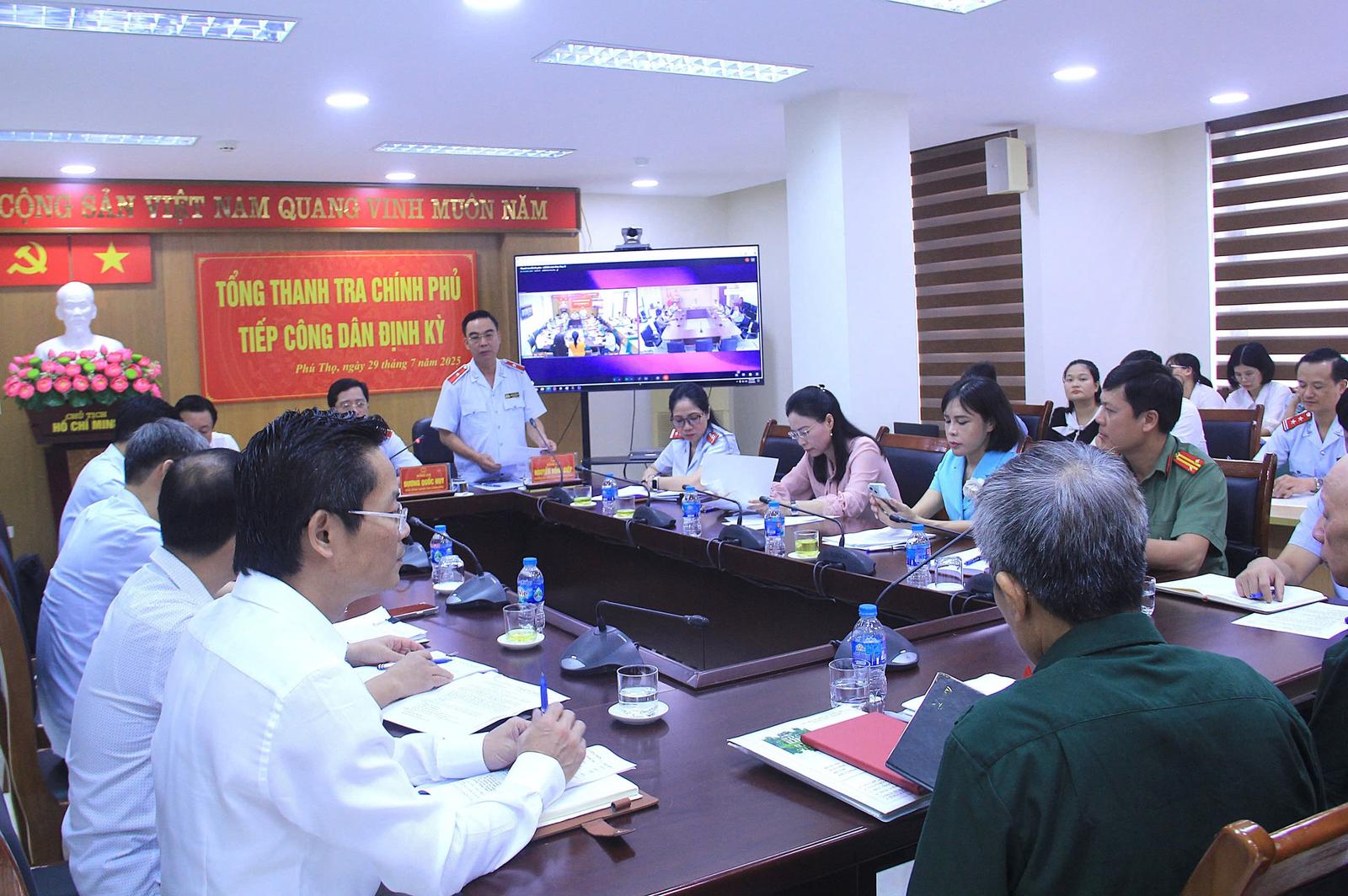 (Thanh tra) - Ngày 29/7, tại Trụ sở tiếp công dân (TCD) tỉnh Phú Thọ, Phó Tổng Thanh tra Chính phủ Dương Quốc Huy chủ trì buổi TCD định kỳ tháng 7/2025 của Tổng Thanh tra Chính phủ để xem xét một số vụ việc khiếu nại, kiến nghị của công dân trên địa bàn tỉnh Phú Thọ. Buổi TCD được kết nối trực tuyến với Trụ sở TCD Trung ương.