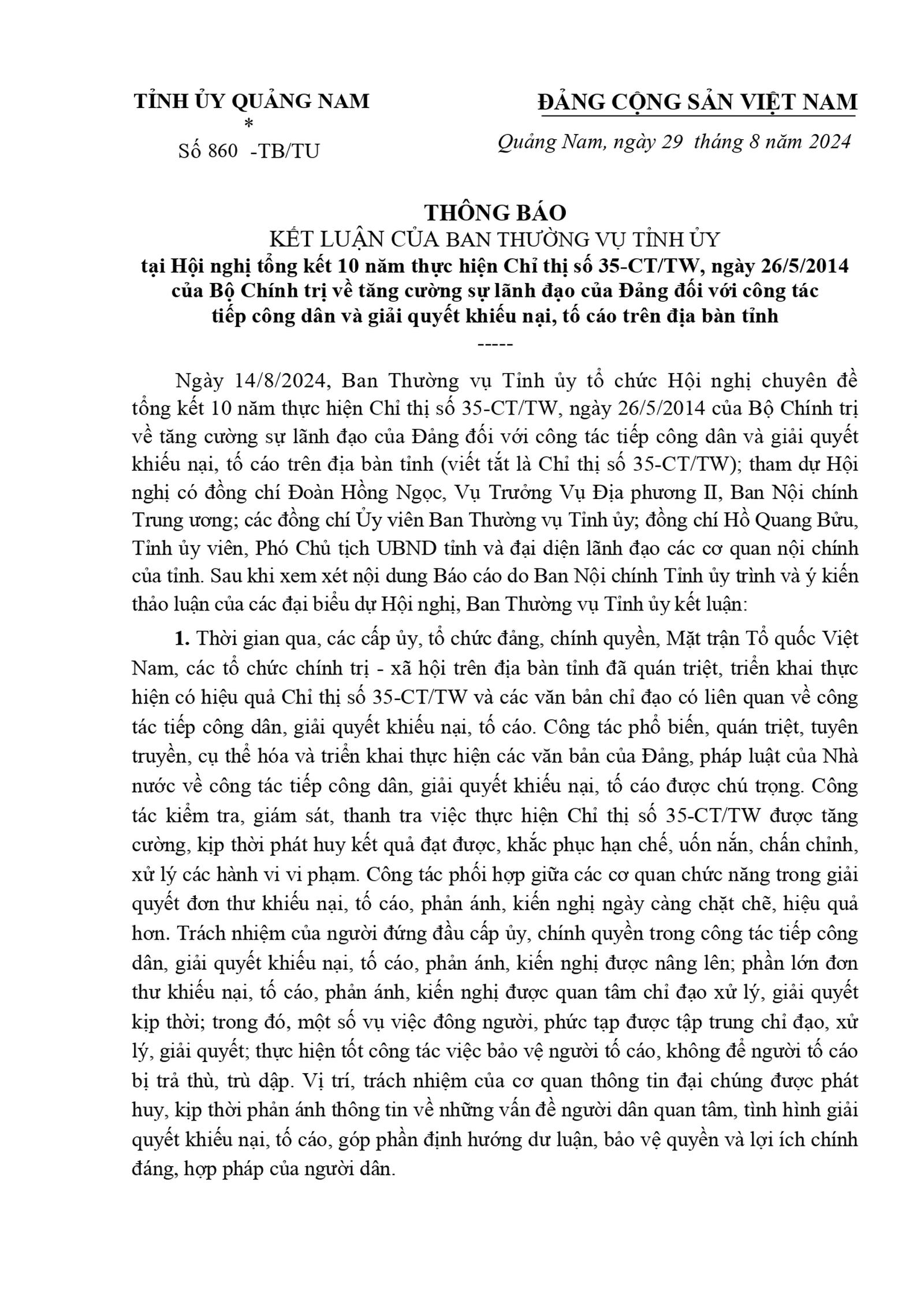 Thông báo số 860-TB/TU ngày 29/8/2024 của Ban thường vụ Tỉnh ủy Quảng Nam. Ảnh: TN