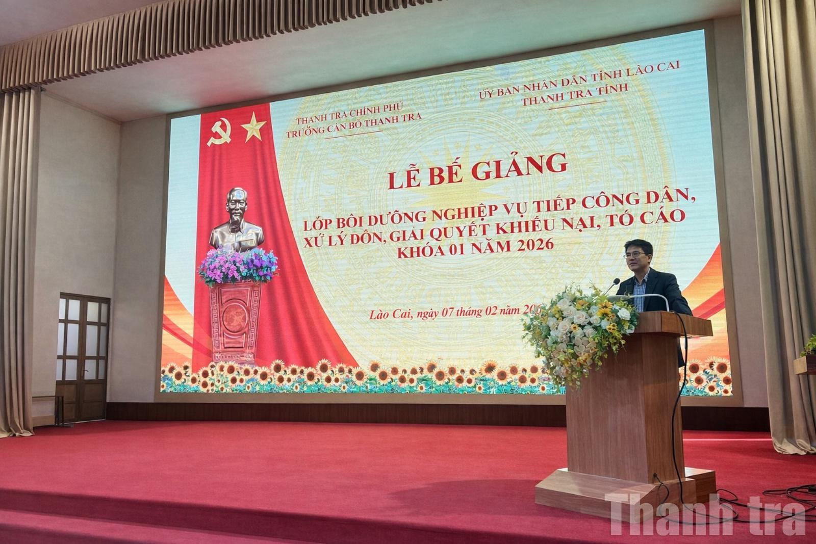 Tại lễ bế giảng, lãnh đạo Thanh tra tỉnh Lào Cai trân trọng cảm ơn sự quan tâm, chỉ đạo của Thanh tra Chính phủ, UBND tỉnh; sự phối hợp chặt chẽ của Trường Cán bộ Thanh tra trong công tác đào tạo, bồi dưỡng chuyên môn nghiệp vụ. Tin tưởng sau lớp học, công tác tiếp công dân, giải quyết khiếu nại, tố cáo trên địa bàn tỉnh Lào Cai sẽ có nhiều chuyển biến tích cực, Thanh tra tỉnh sẽ tiếp tục phối hợp tổ chức các lớp bồi dưỡng nghiệp vụ tiếp theo, đáp ứng yêu cầu quản lý nhà nước trong tình hình mới.