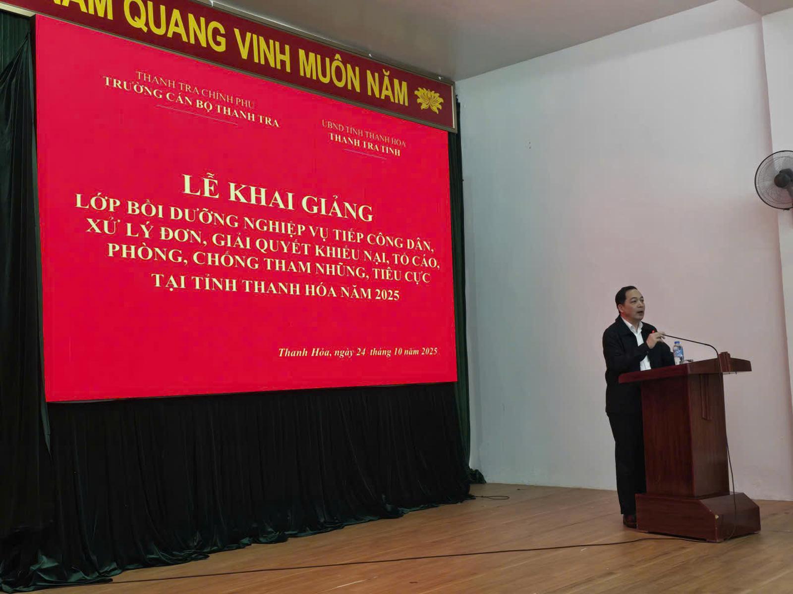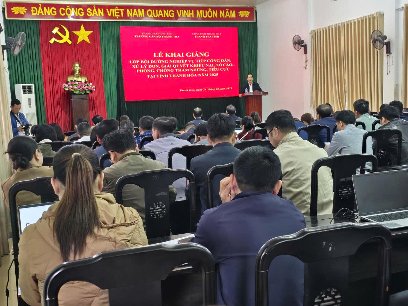 (Thanh tra) - Ngày 24/10, tại tỉnh Thanh Hóa, Trường Cán bộ Thanh tra phối hợp với Thanh tra tỉnh Thanh Hóa tổ chức khai giảng lớp “Bồi dưỡng nghiệp vụ tiếp công dân, xử lý đơn, giải quyết khiếu nại, tố cáo, phòng chống tham nhũng, tiêu cực năm 2025”. Lớp học nhằm nâng cao năng lực, kỹ năng thực thi công vụ cho đội ngũ cán bộ, công chức trong bối cảnh chính quyền địa phương 2 cấp chính thức đi vào hoạt động.