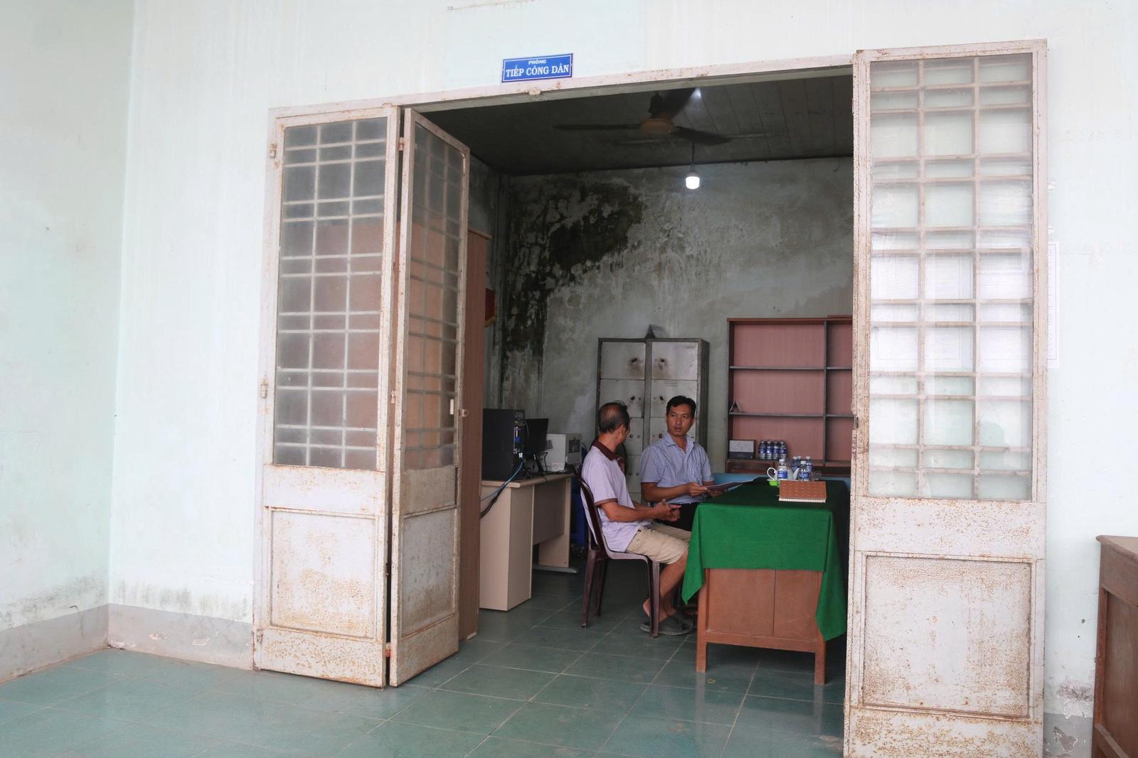 Công chức Phạm Thanh Sang (bên phải) tiếp công dân tại một phòng tạm, trong thời gian chờ trụ sở mới của UBND xã Thành Thới xây dựng xong