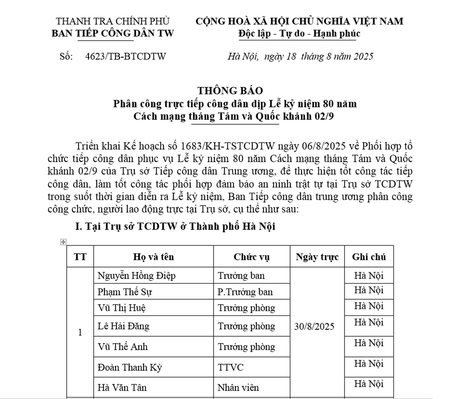 Theo Thông báo, Ban Tiếp công dân Trung ương đã phân công lịch trực cụ thể tại Trụ sở 1 Ngô Thì Nhậm (Hà Nội) trong dịp nghỉ lễ Quốc khánh 2/9. Đáng chú ý, Trưởng Ban Tiếp công dân Trung ương Nguyễn Hồng Điệp và các Phó trưởng Ban trực xuyên suốt từ 30/8 - 2/9 tại hai Trụ sở tiếp công dân Trung ương ở Hà Nội và TP Hồ Chí Minh. Ngoài ra, trưởng phòng, phó phòng, công chức, người lao động cũng được phân công trực xuyên suốt để bảo đảm mọi kiến nghị, phản ánh của công dân đều được tiếp nhận kịp thời.