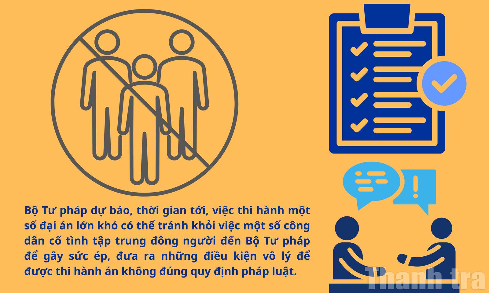 Về dự báo tình hình khiếu nại, tố cáo trong thời gian tới, theo Bộ Tư pháp, một số vụ việc đại án như vụ Vạn Thịnh Phát, vụ FLC bắt đầu bước vào giai đoạn thi hành án. Mặc dù Bộ Tư pháp đã chuẩn bị đầy đủ các nguồn lực, ứng dụng chuyển đổi số vào công tác thi hành án nhưng có thể sẽ không tránh khỏi việc một số công dân cố tình tập trung đông người đến Bộ Tư pháp để gây sức ép, đưa ra những điều kiện vô lý để được thi hành án không đúng quy định pháp luật.