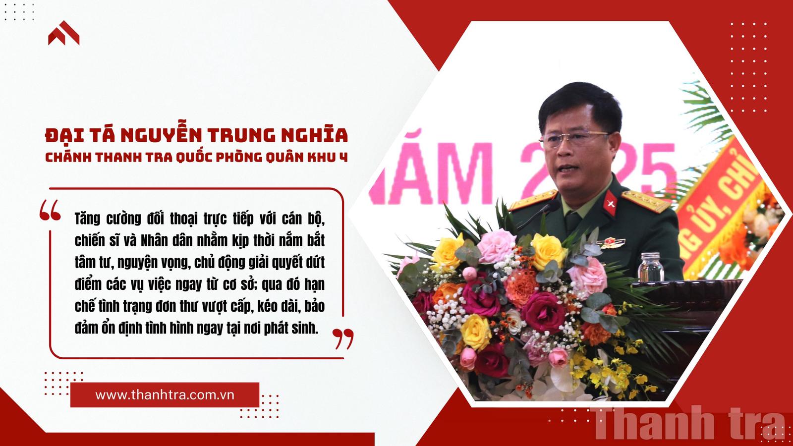 Tại Hội nghị tổng kết công tác thanh tra quốc phòng năm 2025 diễn ra ngày 3/2/2026, Đại tá Nguyễn Trung Nghĩa, Chánh Thanh tra Quốc phòng Quân khu 4, nhấn mạnh tầm quan trọng của việc kiện toàn tổ chức, nâng cao năng lực cán bộ và đề xuất các giải pháp mang tính chiến lược nhằm đảm bảo sự ổn định cho các cơ quan, đơn vị trong tình hình mới.