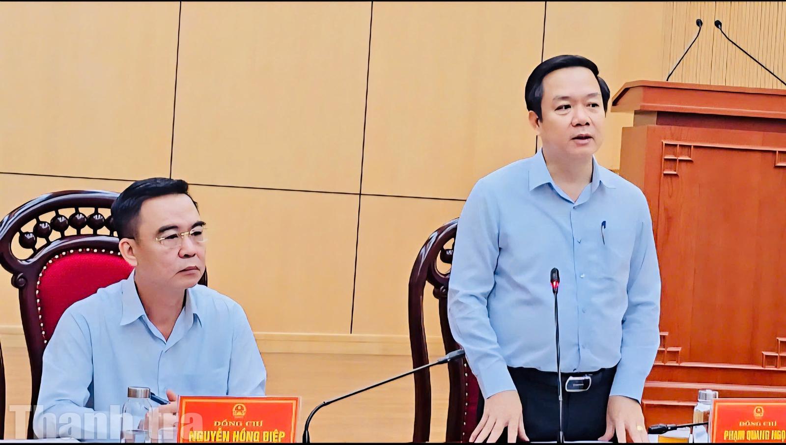 Ông Phạm Quang Ngọc, Chủ tịch UBND tỉnh phát biểu tại cuộc họp; ông Nguyễn Hồng Điệp, Tổ trưởng Tổ công tác, đồng chủ trì. Ảnh: Lan Anh.