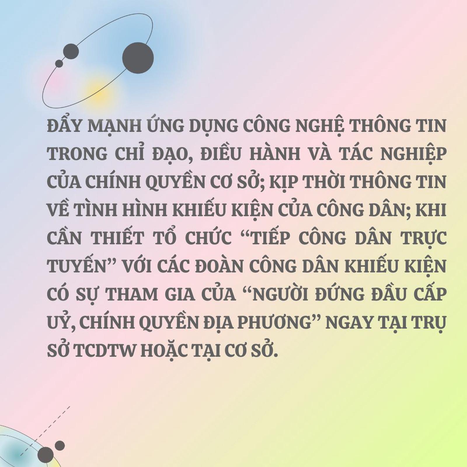 Đẩy mạnh ứng dụng công nghệ thông tin trong chỉ đạo, điều hành và tác nghiệp của chính quyền cơ sở. Đề nghị cấp uỷ, chính quyền địa phương các cấp phải chủ động, sớm có các biện pháp, phương án phòng ngừa từ sớm, từ xa việc công dân khiếu kiện bức xúc, tập trung thành các đoàn đông người về Hà Nội. Đồng thời, kịp thời thông tin cho nhau, thông tin cho Trụ sở TCDTW, thông tin cho lực lượng Công an thành phố Hà Nội về tình hình khiếu kiện của công dân; khi cần thiết tổ chức “tiếp công dân trực tuyến” với các đoàn công dân khiếu kiện có sự tham gia của “người đứng đầu cấp uỷ, chính quyền địa phương” ngay tại Trụ sở TCDTW hoặc tại cơ sở.