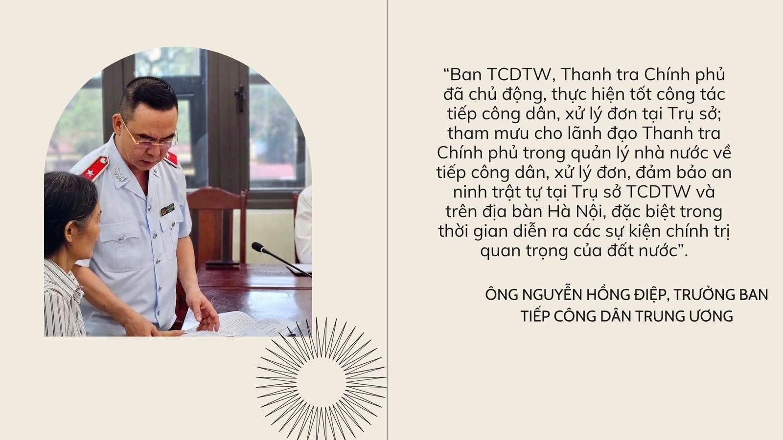 Riêng Ban TCDTW, Thanh tra Chính phủ tiếp 1.738 lượt với 5.451 công dân đến trình bày 1.713 vụ việc (khiếu nại 789 việc, tố cáo 289 việc, kiến nghị và phản ánh 635 việc); có 219 lượt đoàn đông người với 3.535 công dân đến trình bày 215 vụ việc. Tại Hà Nội, qua công tác tiếp công dân đã tiếp 1.566 vụ việc, phát hành 1.180 văn bản hướng dẫn và 60 văn bản chuyển đơn của công dân đến cơ quan có thẩm quyền xem xét, giải quyết và trả lời công dân theo quy định.