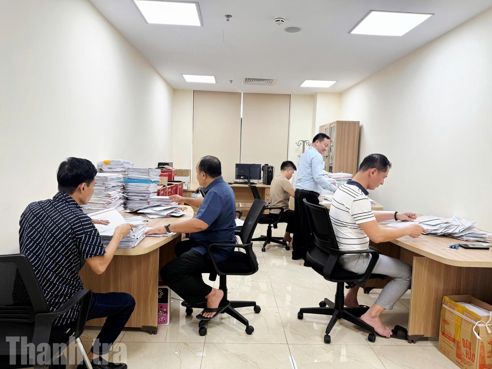 Tập thể Phòng Xử lý đơn cùng nhau xử lý, phân loại đơn do công dân gửi tới. Ảnh: Lan Anh