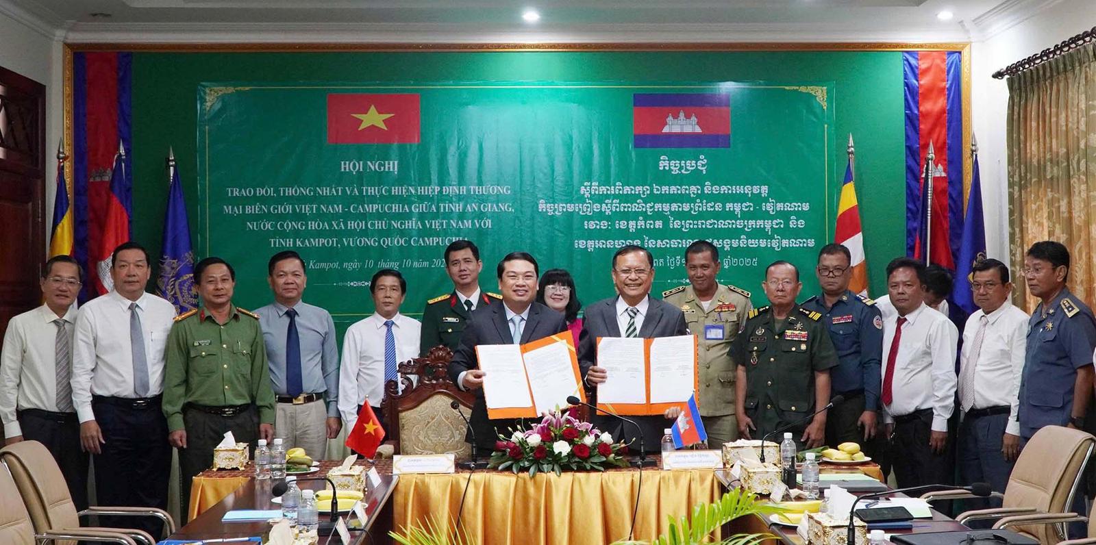 Ký kết biên bản về trao đổi, thống nhất và thực hiện Hiệp định Thương mại biên giới Việt Nam - Campuchia giữa 2 tỉnh An Giang và Kampot. Ảnh: Cổng TTĐT An Giang