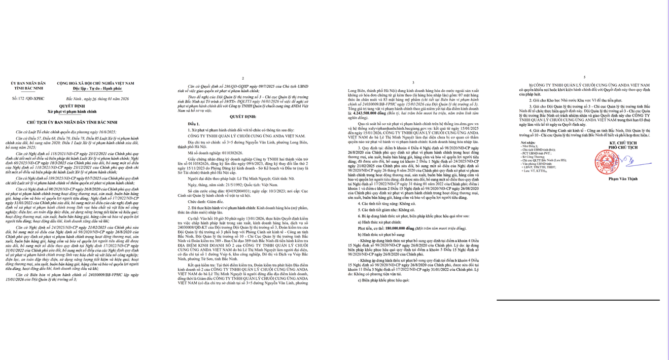 Trước đó, vào lúc 10 giờ 50 phút ngày 13/1/2026, Đội Quản lý thị trường số 3 phối hợp với Phòng Cảnh sát kinh tế, Công an tỉnh Bắc Ninh, Đội Quản lý thị trường số 10 và Đoàn kiểm tra 389 tỉnh đã tiến hành kiểm tra địa điểm kinh doanh số 2 của Công ty TNHH Quản lý chuỗi cung ứng ANDA Việt Nam tại Khu công nghiệp, Đô thị và Dịch vụ VSIP Bắc Ninh, phường Từ Sơn, tỉnh Bắc Ninh.