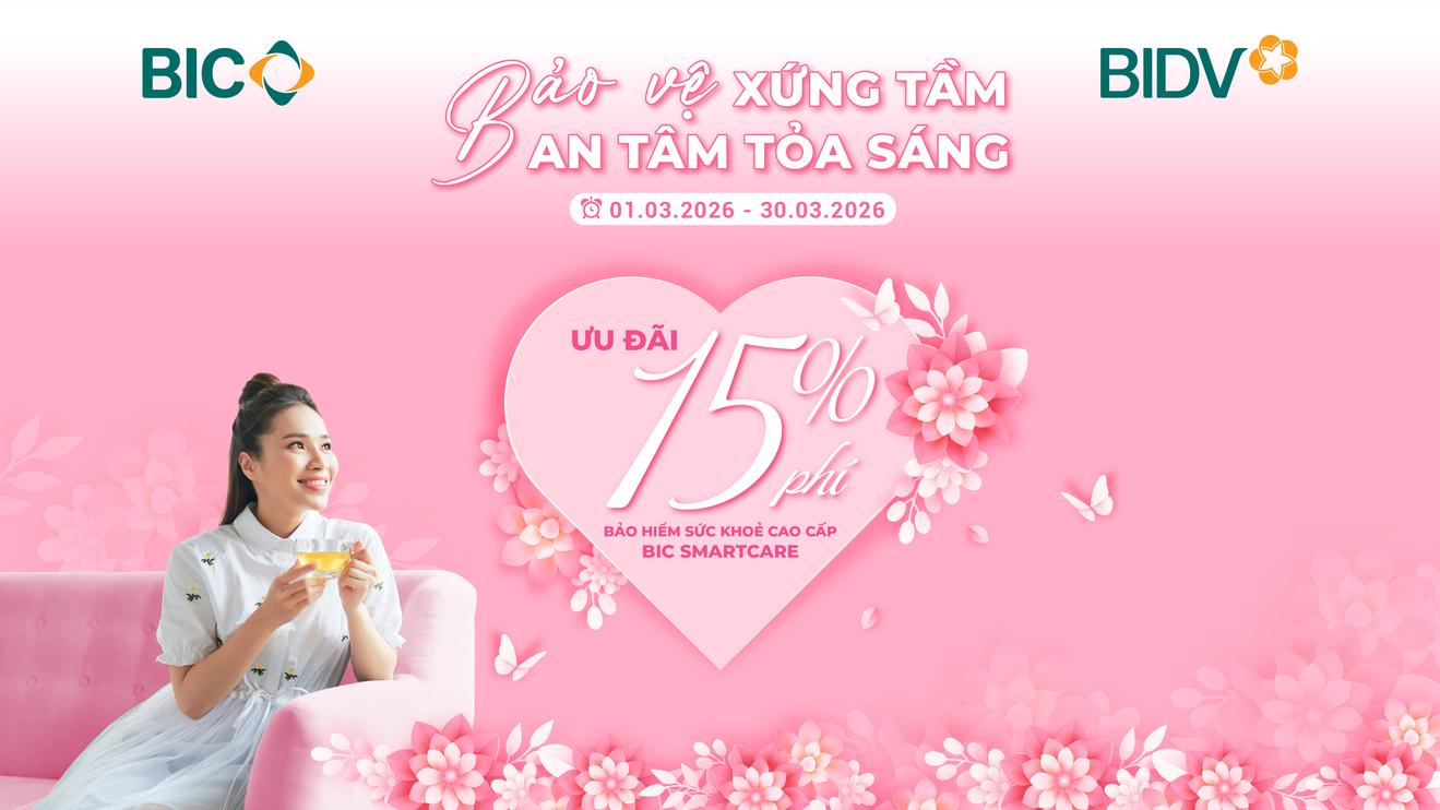 (Thanh tra) - Chào mừng Ngày Quốc tế Phụ nữ 8/3, từ ngày 01/03/2026 đến ngày 30/03/2026, Tổng Công ty Bảo hiểm BIDV (BIC) gửi tặng phái đẹp ưu đãi giảm 15% phí khi tham gia bảo hiểm sức khỏe cao cấp BIC SmartCare.