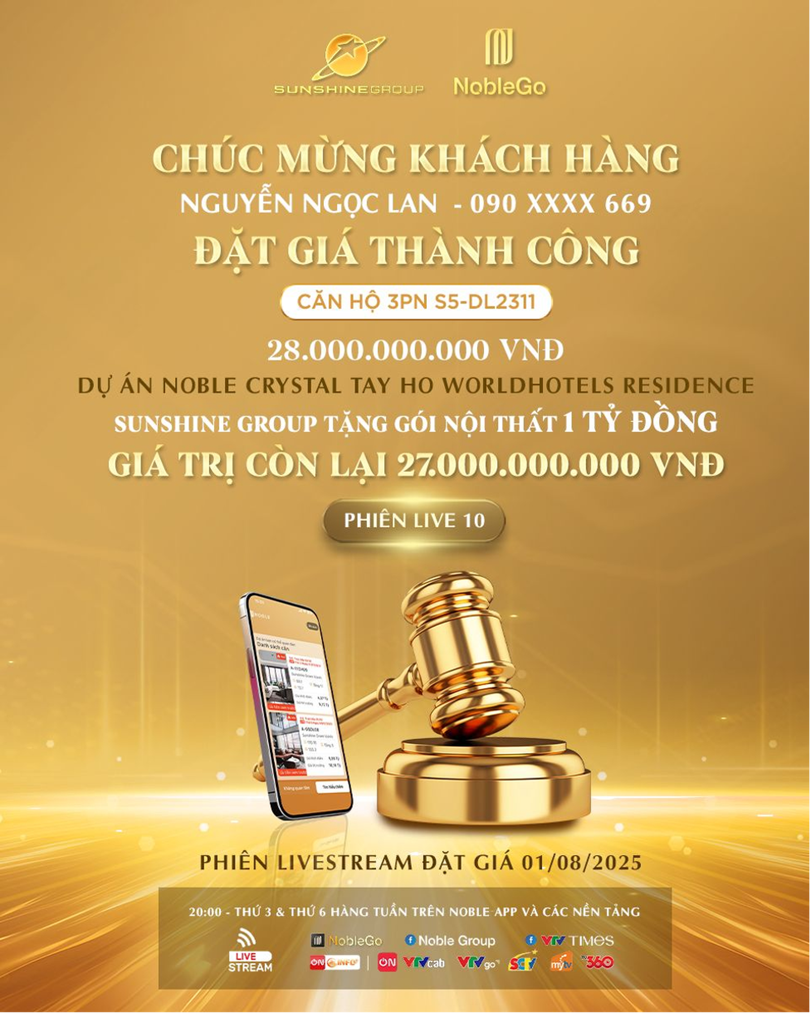 Đáng chú ý, mức giá khởi điểm cho căn hộ này chỉ từ 17,3 tỷ đồng, bằng 50% giá thị trường, tạo nên cuộc đua đặt giá kịch tính chưa từng có, thu hút hơn 11.000 khách hàng theo dõi trực tiếp cùng thời điểm trên đa nền tảng. Không chỉ vậy, livestream còn mang đến khoảnh khắc bùng nổ khi giải thưởng may mắn 20 triệu đồng đã xướng tên một khán giả theo dõi trực tiếp trên Noble App, góp phần biến trải nghiệm đặt giá bất động sản trở thành một sự kiện tương tác hấp dẫn và ngập tràn cảm xúc.