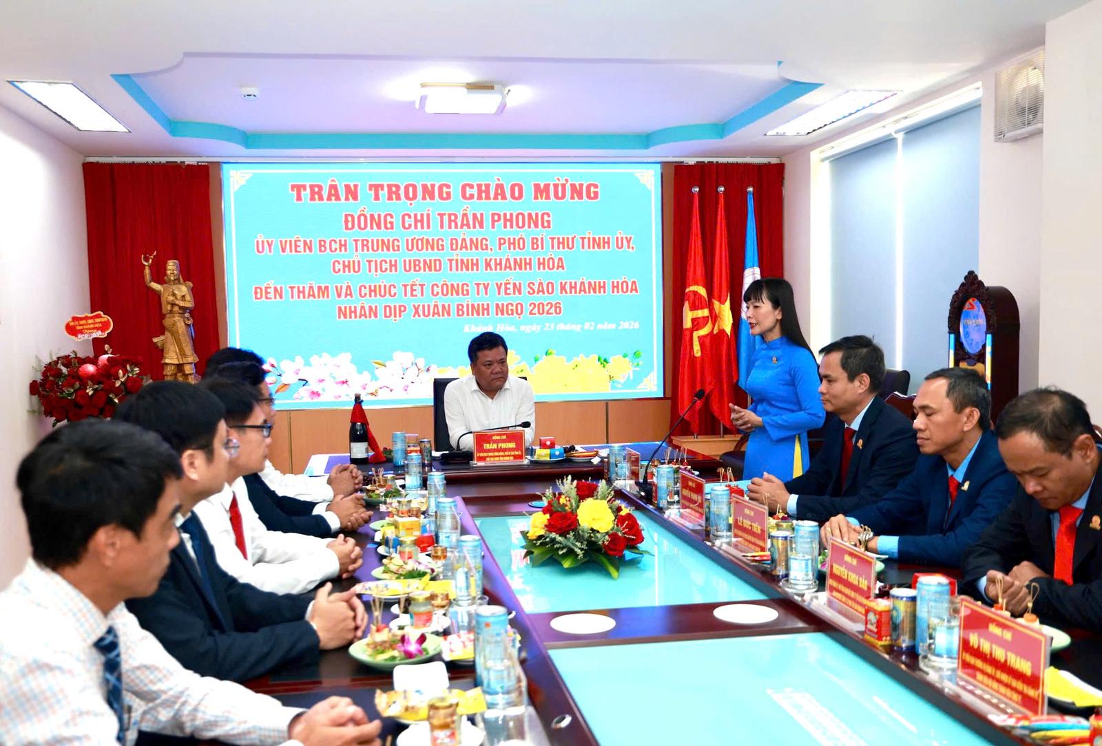 (Thanh tra) - Sáng ngày 23/02/2026, nhân dịp Xuân Bính Ngọ, Chủ tịch UBND tỉnh Khánh Hòa đã đến thăm, chúc Tết tại Công ty Yến sào Khánh Hòa. Buổi thăm và làm việc diễn ra trong không khí phấn khởi đầu xuân, thể hiện sự quan tâm sâu sắc của lãnh đạo tỉnh đối với doanh nghiệp nòng cốt, có đóng góp quan trọng cho sự phát triển Kinh tế xã hội của địa phương.