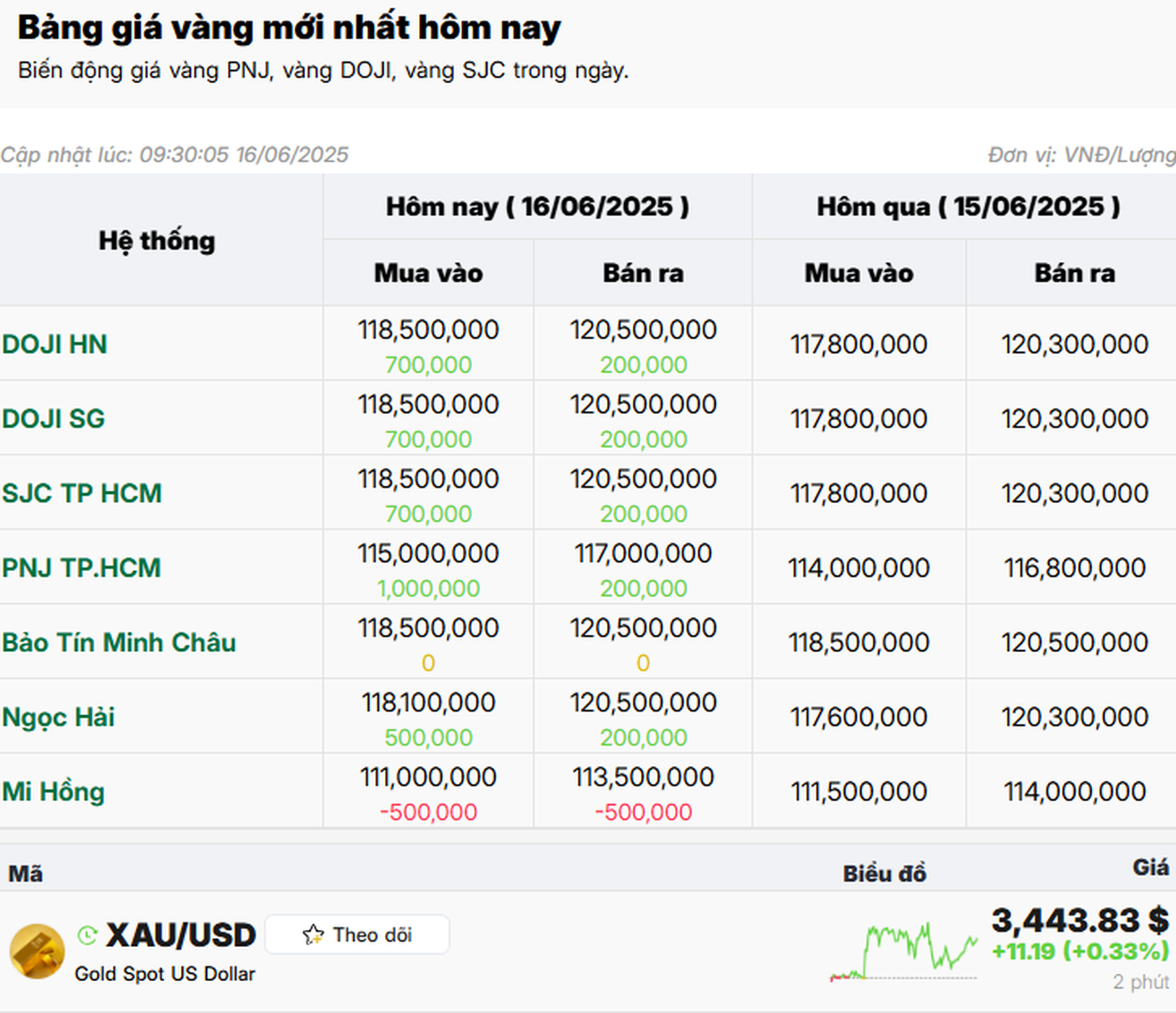 Thị trường vàng trong nước sáng nay tiếp tục chứng kiến một phiên tăng giá của kim loại quý này. Tại thời điểm 9h30 ngày hôm này (16/6/2025), Công ty Vàng bạc Đá quý Sài Gòn (SJC) niêm yết giá vàng miếng ở mức 118,5 - 120,5 triệu đồng/lượng (mua vào - bán ra). Mức giá này tăng hơn từ 200 đến 700 nghìn đồng/lượng so với cuối tuần trước.